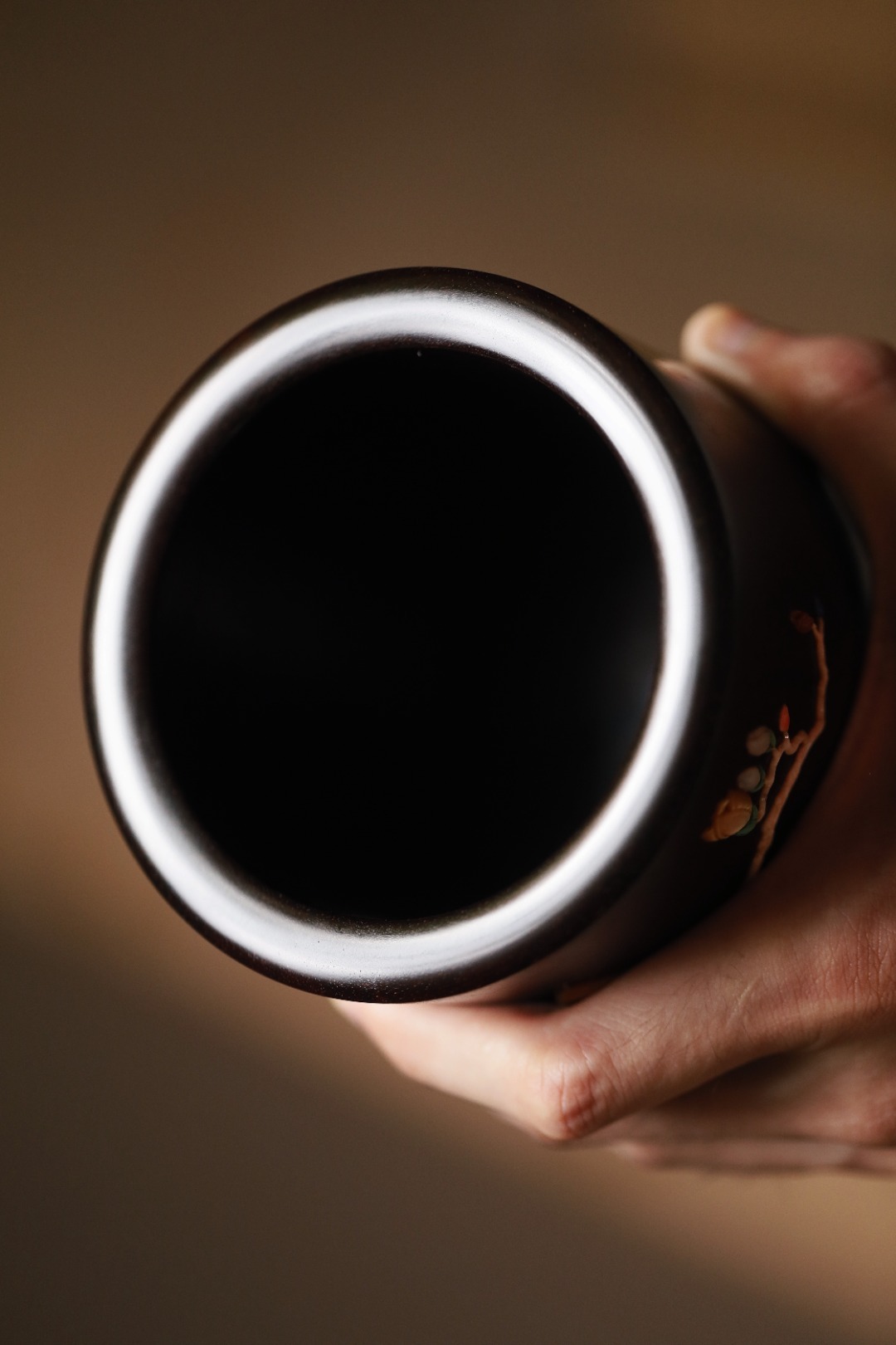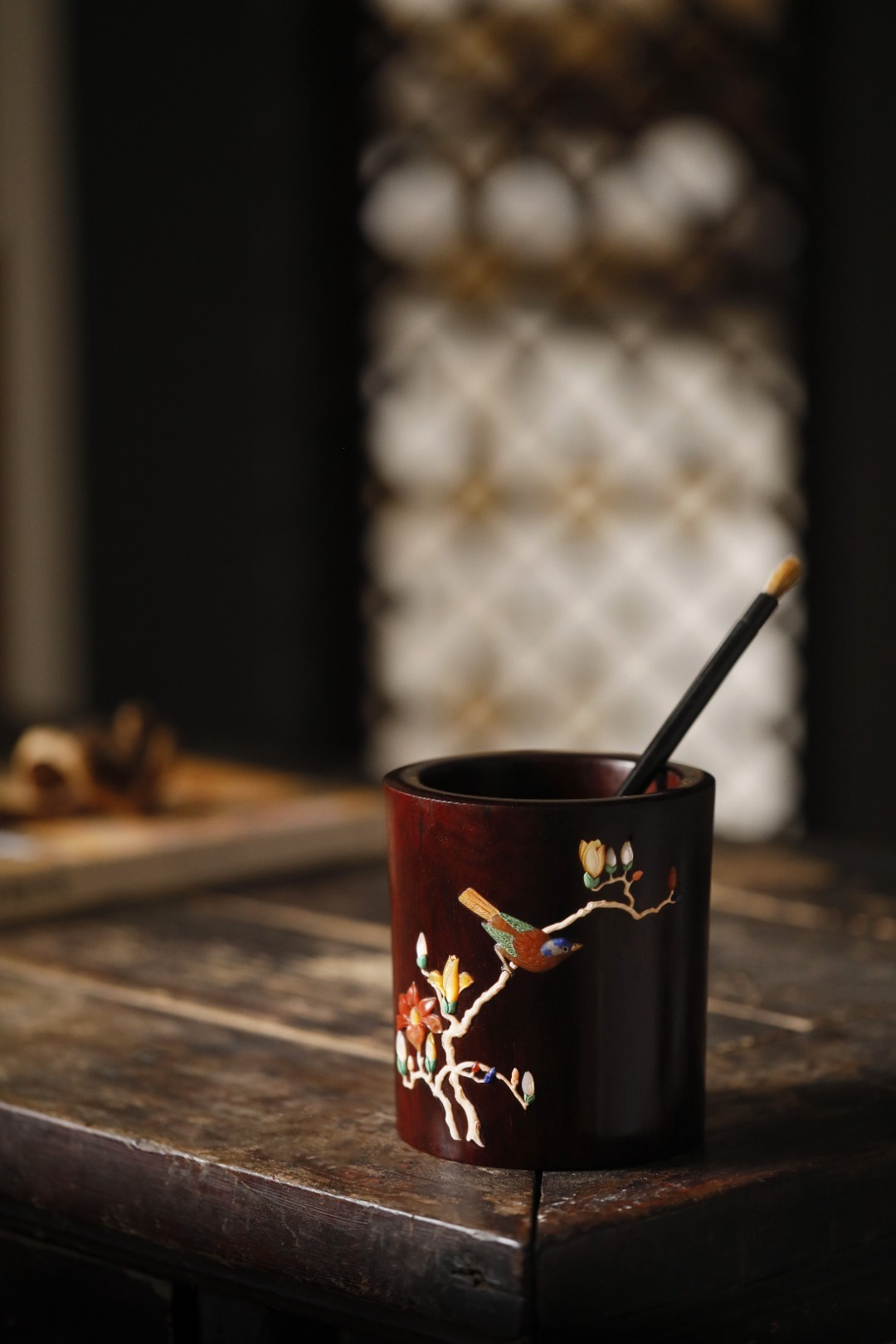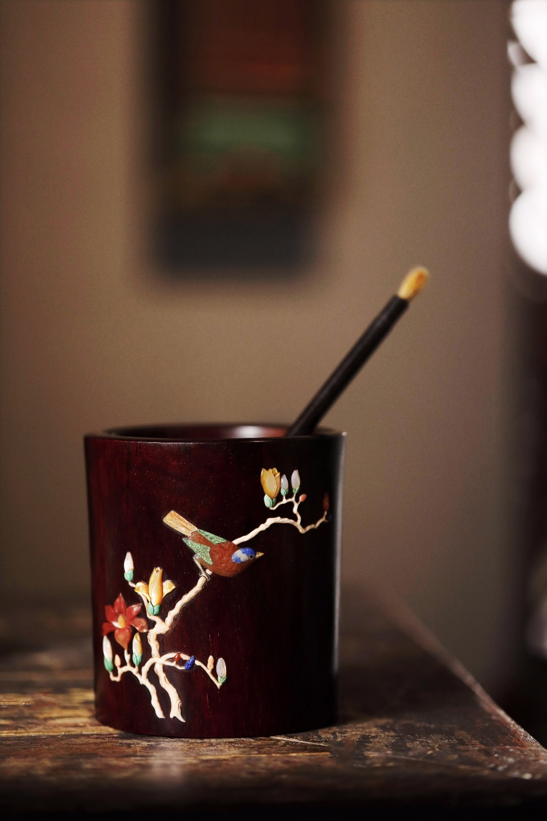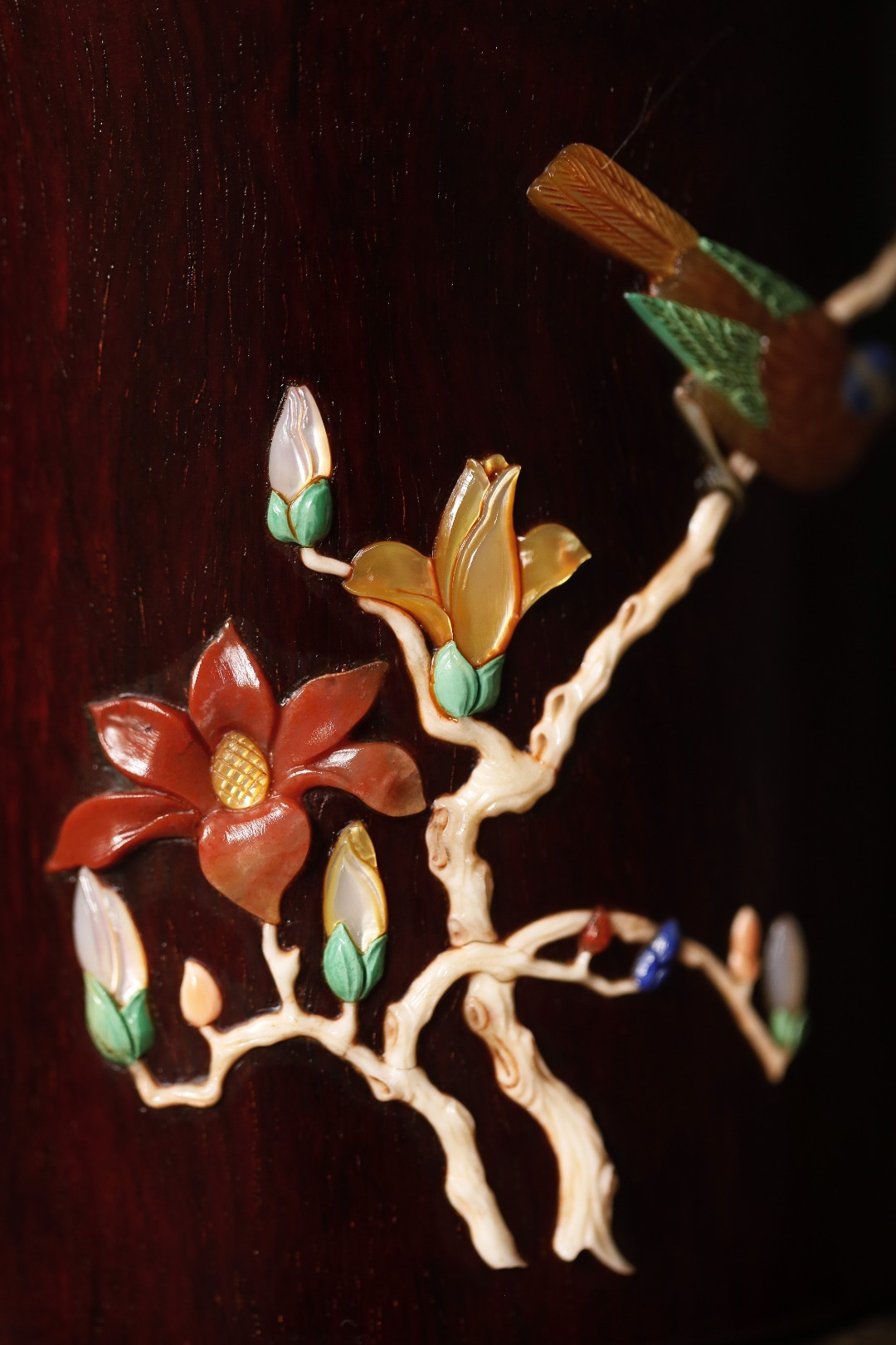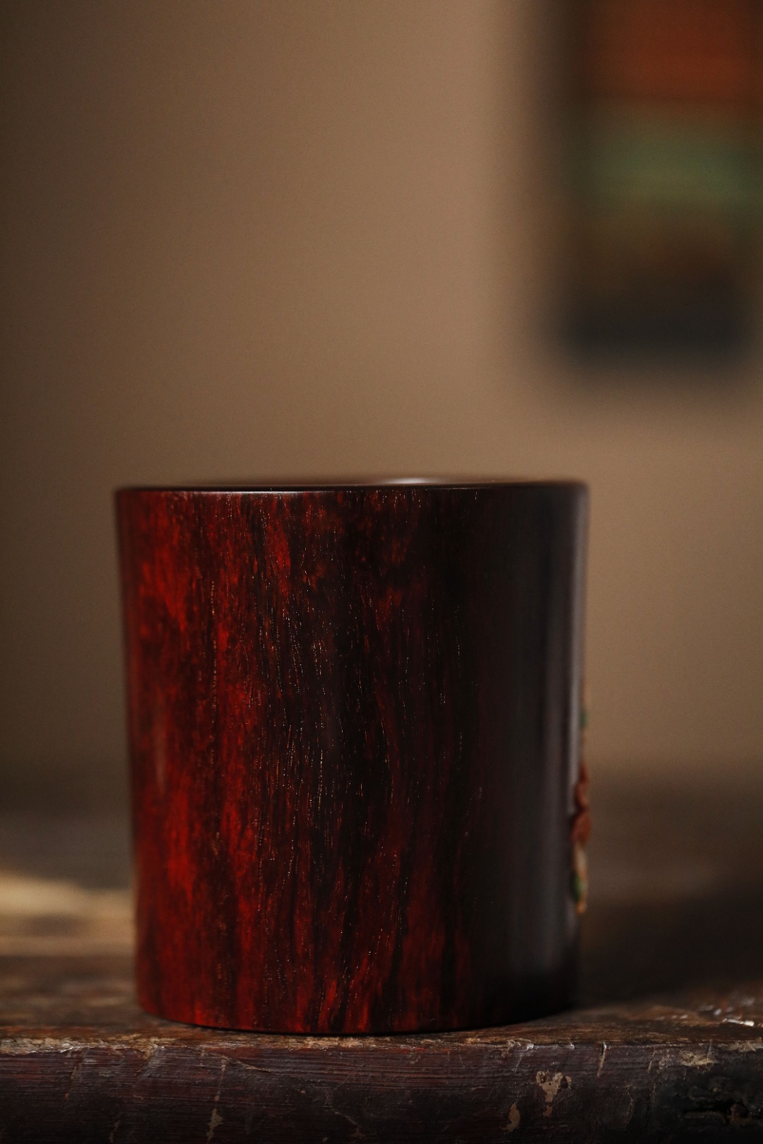 小叶紫檀【玉堂富贵】笔筒择取带金星老料一木挖掏,外壁以百宝饰玉堂富贵图,画面生机