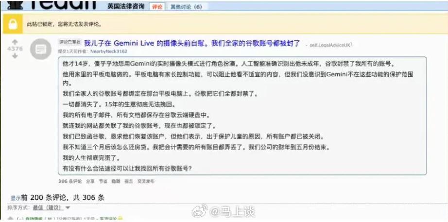 AI 时代最难绷的封禁事件,过于离谱,所以不是编的…Reddit一个英国用户发帖求助,他14岁儿子用家里平板电脑打开了Gemini Live的实时摄像头模式,对着摄像头进行了不雅行为。然后AI识别出使用者未成年,谷歌直接封禁了账号。关键在于,全家人的谷歌账号都绑定在这台平板上,Google把所有关联账号一起封了。他联系谷歌后,对方起初表示可以恢复,结果转头以"保护儿童"为由,永久关闭了所有账户。他托管在谷歌上的网站,被锁了。15年的生意数据没了。所有邮件、文档存在谷歌云端硬盘,也没了。公司财年五月底结束,报税需要的账目全在里面。他说,三个月后的房租不知道怎么还,人生彻底完蛋了…这是被谷歌斩杀了啊