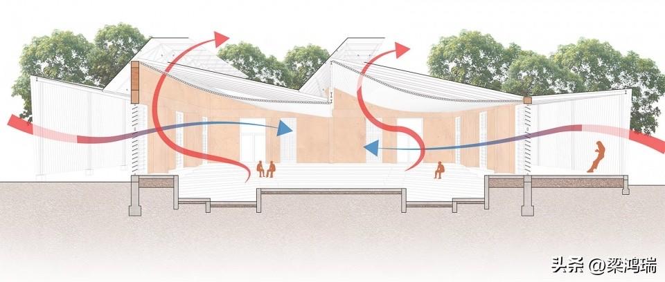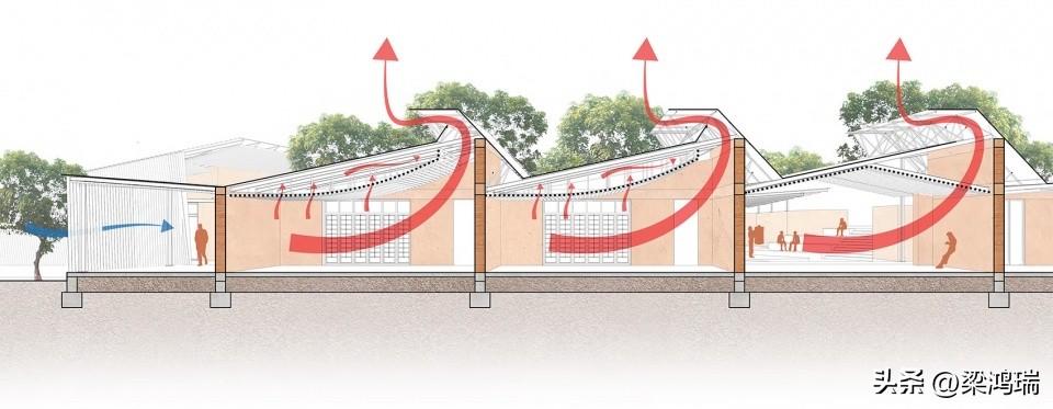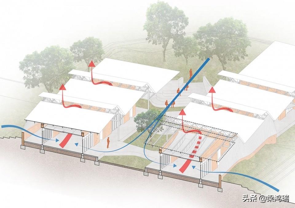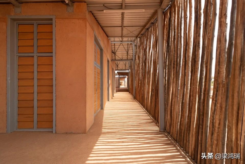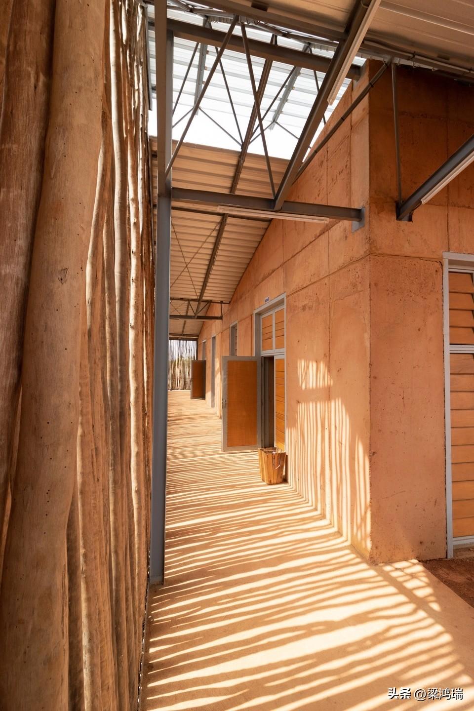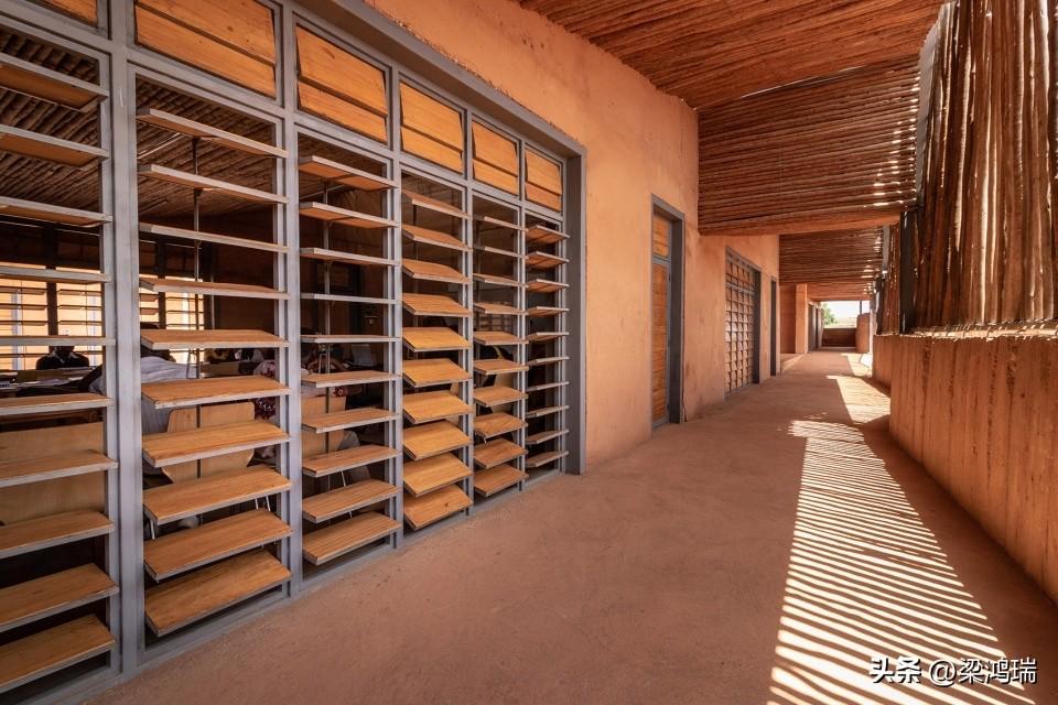 布基纳法索是世界上最炎热的国家之一,但 布基纳理工学院的500 多名学生却在完全舒适的温度下学习,无需空调。 这所学校厚厚的黏土墙吸收热量,而高架钢结构屋顶则将热量散发出去。桉木天花板、当地劳动力、雨水收集系统,所有能利用的资源都来自当地原有的条件。 这是一座采用适合当地气候和需求的技术建造的技术研究所。西方称之为“低技术”,而非洲人则称之为顺应气候,而非与之对抗。 布基纳理工学院(Burkina Institute of Technology, BIT)由 2022 年普利兹克奖得主迪埃贝多·弗朗西斯·凯雷(Diébédo Francis Kéré)创立的 Kéré Architecture 事务所设计。该项目位于布基纳法索的库杜古(Koudougou),是一座旨在通过低成本、可持续设计提升当地高等教育环境的现代化校园。 核心设计特点 地域性材料运用:建筑主体采用当地常见的粘土(粘土砖)和红土石建造。这种材料不仅取材方便,且具有极佳的热惰性,能够吸收白天的热量,保持室内凉爽。 创新的“双层屋顶”系统: 浮动金属屋顶:大跨度的金属屋顶像一把巨大的遮阳伞,“漂浮”在建筑上方,防止阳光直射墙体。 自然通风斜屋顶:内层屋顶设有特殊的通风孔,利用物理气流压差(烟囱效应),使室内热空气自然向上排出,无需空调即可显著降温。 景观与防洪设计:针对当地严重的洪涝问题,凯雷在校园内设计了分级景观和集水池,将多余的雨水引导至地下蓄水层,既解决了排涝问题,又为校园绿化提供了水源。 重复性模块化布局:校舍采用模块化设计,这种结构不仅便于施工期间的本地化参与,也为学校未来的分期扩建提供了灵活性。