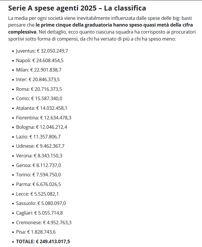 意大利足协公布了2025年各俱乐部支出的经纪人佣金数据,整个联赛总体涨幅10%,
