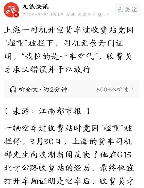 上海,男子驾驶空货车过收费站,却被收费人员拦下,定性为超载。男子赶紧给收费人员解释,他开的是空车,怎么可能超载,但收费人员不听,也不查看车辆情况,就是一口咬定电脑显示车辆超载。男子气不过,打开车厢证明,收费人员这才态度变好,承认这是设备故障。男子:要不是空车,我还真的有理说不清了。 上海某收费站的通道旁,男子站在自己的空货车旁,脸色依旧带着未消的怒气,看着收费人员递来的歉意示意,心里满是无奈。他怎么也没想到,自己开着空无一物的货车过站,竟被当场拦下定性为超载,若不是当场打开车厢证明清白,这笔“莫须有”的超载账,还真的有理说不清。 男子是一名货车司机,常年靠跑运输谋生,当天他刚送完一批货物,驾驶着空货车返程,途经上海一处收费站,本以为能顺利缴费通行,却没料到,刚驶上称重台,就被收费人员拦了下来,一场让人窝火的闹剧就此开始。 收费人员示意男子停车,语气强硬地告知他,车辆涉嫌超载,无法正常通行,需要按规定处理。男子瞬间愣住了,自己明明开的是空车,车厢里连一点货物都没有,怎么可能出现超载的情况,他下意识地就想向收费人员解释清楚。 男子耐着性子,反复说明自己的货车是空车,不存在超载的可能,还提出让收费人员亲自查看车厢,验证自己的说法。可收费人员却丝毫不听,也没有走向货车查看的意思,只是死死盯着电脑屏幕,一口咬定电脑显示车辆超载。 看着收费人员强硬又敷衍的态度,男子心里的火气渐渐上来了。他常年跑运输,清楚空货车的重量,更知道超载的判定标准,电脑显示的数值明显不符合实际,可对方却拒绝核实,只凭设备数据就随意定性,这让他难以接受。 男子越想越气,争执间,他索性下车,走到货车车厢旁,一把拉开了车厢门,示意收费人员过来查看。空荡荡的车厢里,没有任何货物,连一点杂物都没有,一目了然,足以证明他没有说谎,也不存在任何超载的情况。 收费人员见状,才不情不愿地走到货车旁,探头查看了车厢内部,看到空无一物的车厢后,原本强硬的态度瞬间软了下来,脸上也露出了尴尬的神色,再也没有了之前的笃定,沉默片刻后,终于承认了问题所在。 收费人员解释,之所以会判定超载,是因为收费站的称重设备出现了故障,大概率是称重传感器接线松动,导致称重数据异常,才出现了空车被误判为超载的情况,还连连向男子表达歉意,希望能获得谅解。 男子看着对方诚恳道歉的样子,心里的火气虽未完全消散,却也没有再过多追究。他清楚设备难免会出现故障,但让他不满的是,收费人员没有核实就随意定性,若不是自己开的是空车,有足够的证据证明清白,后果不堪设想。 据悉,该收费站的称重设备,此前就曾出现过几次数据波动的情况,只是一直没有及时检修维护,才导致此次误判事件的发生。此次事件后,收费站工作人员也对现场所有称重设备进行了全面检查,排查故障隐患。 男子坦言,跑运输本来就不容易,每天起早贪黑,还要应对各种突发情况,这次被误判超载,不仅耽误了自己的返程时间,还让自己受了一肚子气。最让他后怕的是,若是当时车厢里有货物,哪怕没有超载,也很难说清。 当时现场有不少过往车主目睹了整个过程,有人拍下了男子打开车厢证明清白的画面,传到网上后,很快引发了不少网友的关注。大家纷纷议论此事,感慨收费人员的敷衍,也理解男子的委屈和无奈。 其实,收费站称重设备故障并非个例,偶尔会出现传感器异常、数据不准的情况,这就需要收费人员多一份细心,遇到异常情况时,及时核实,而不是仅凭设备数据就随意判定,避免给车主带来不必要的麻烦。 男子在收费人员的道歉和快速处理下,终于顺利通过了收费站,继续踏上返程之路。只是这场突如其来的误判,还是在他心里留下了印记,也让他多了一份警惕,往后过收费站,总会多留意一下称重数据。 设备故障可以理解,也可以及时检修,但工作人员的敷衍态度,却让人难以认同。一场空车被误判超载的闹剧,看似小事,却藏着工作中的疏忽,也让车主多了一份不必要的麻烦。 对此,你们有什么看法,欢迎评论留言~