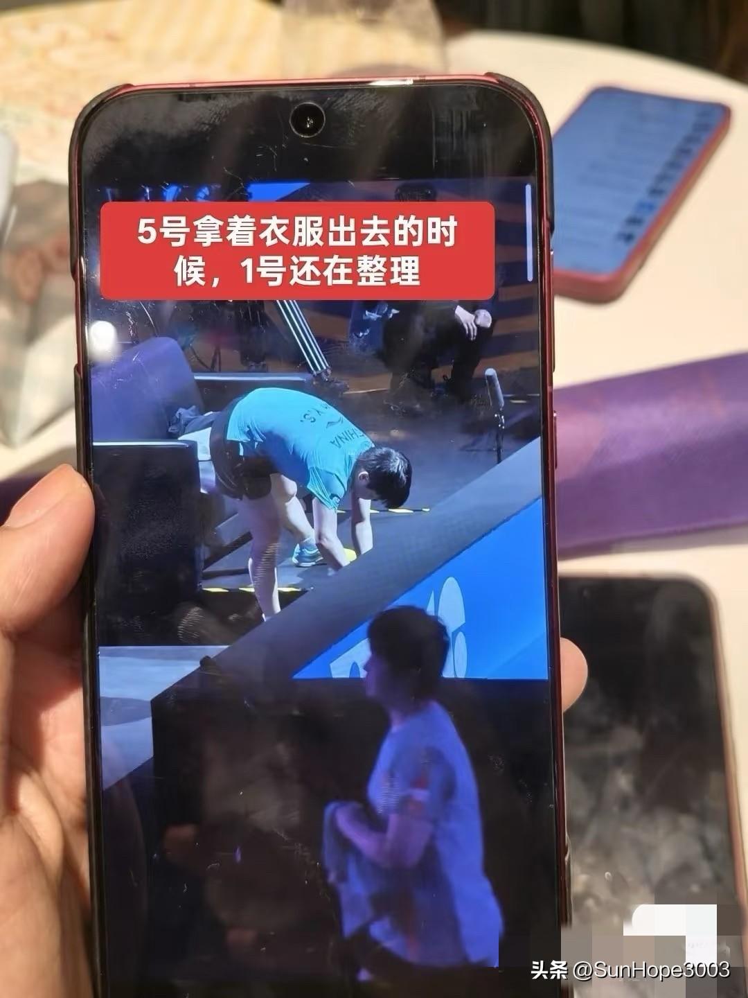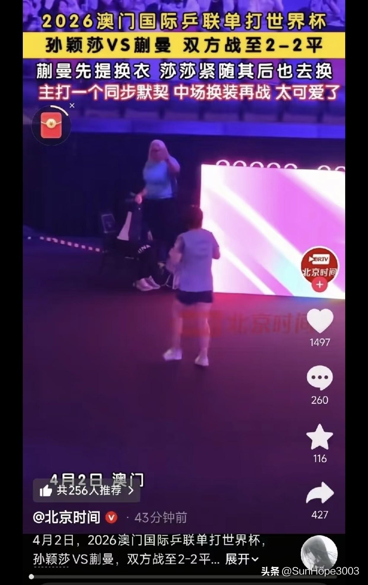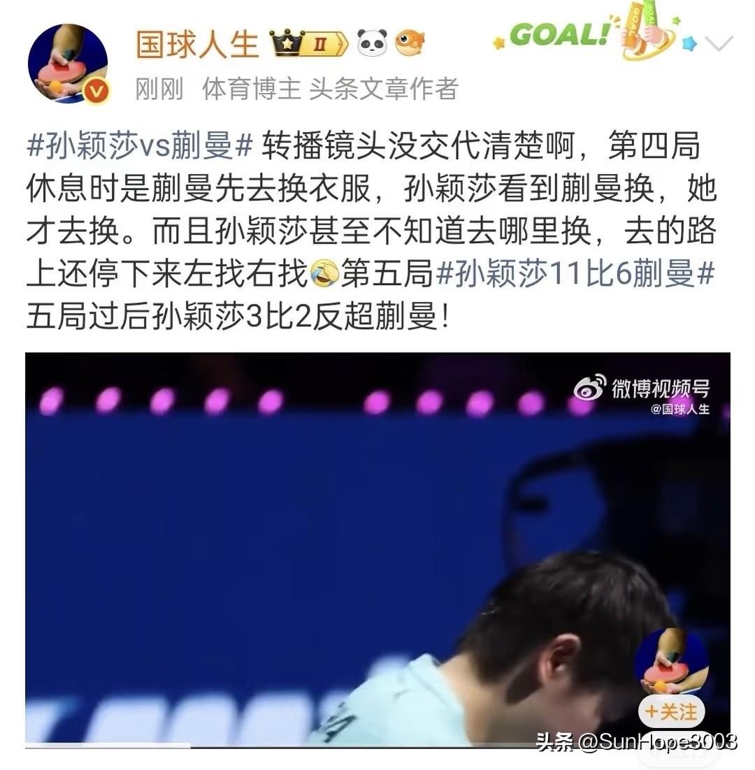 莎莎换衣服之前,蒯曼先去换的,这有什么可争议的呢! 蒯曼在工作人员的带领下,在莎莎后面走过去了,蒯曼先去换了衣服, 然后莎莎在包里拿出一件比赛服,给工作人员示意,要换一件衣服。 ittf直播信号就盯着莎莎拍了,但是现场这么多球迷,这么多镜头, 都拍到了,蒯曼先去的。 再就是,局间换衣服,这是规则允许的, 有什么可吵的呢,真的是不太理解。 恭喜莎莎4-2赢下比赛,蒯曼也很辛苦, 两个人奉献了一场精彩的比赛。