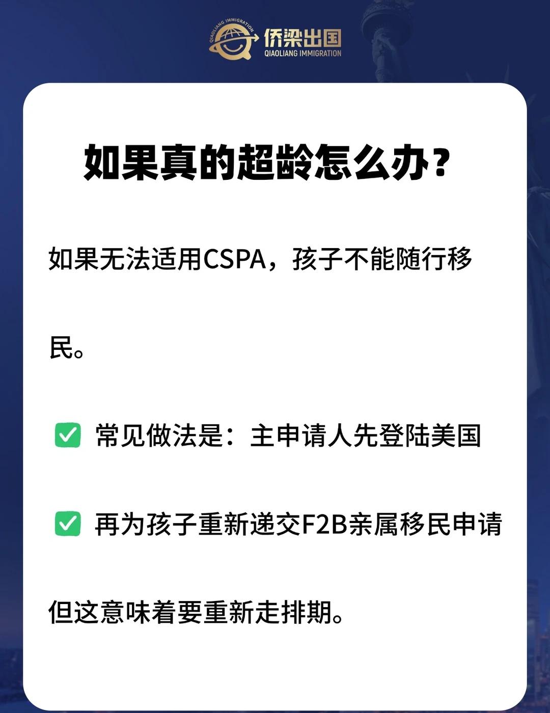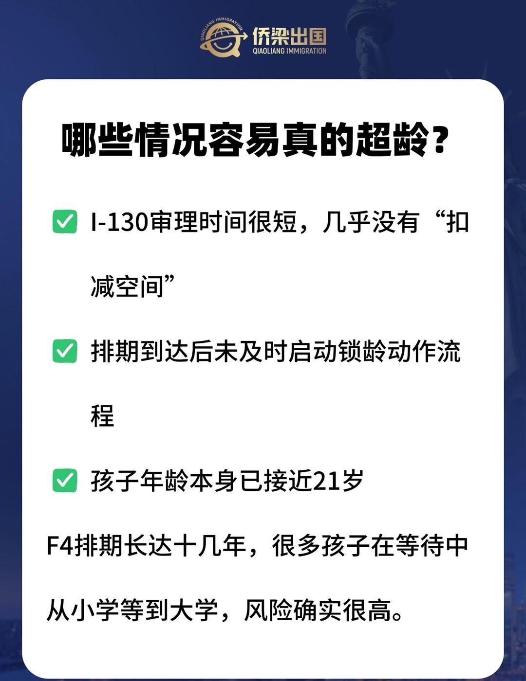 F4移民排期到子女却超龄了,还能拿绿卡吗? 美国F4兄弟姐妹移民,很多家庭一等就是十几年。 好不容易排期到了,准备面签,却发现:孩子年龄超了,不能随行移民。 这是F4里很常见、也令人焦虑的问题。 先说一个关键点:移民局判断是否“超龄”,不是只看实际年龄,而是看CSPA儿童保护法是否适用。 [一]什么是CSPA? CSPA可以在特定条件下“冻结年龄”。 计算公式是:CSPA年龄 = 排期到时的实际年龄减去I-130审理时间 如果CSPA年龄仍在21岁以下,孩子就可以继续作为随行子女移民。 但要注意两个前提: 主申请人排期已到 孩子需在排期到达后一年内“采取行动”(如递交材料等),否则可能失去保护资格。 [二]哪些情况容易真的超龄? [三]如果真的超龄怎么办? (见图内容) F4移民难的不是排期,而是时间节点的把控。 如果你的排期快到了,家里有接近21岁的孩子,可以提前测算CSPA年龄~ 美国F4移民 美国F4 美国移民f4 美国亲属移民 F4 子女超龄 CSPA 美国移民锁龄 美国cspa