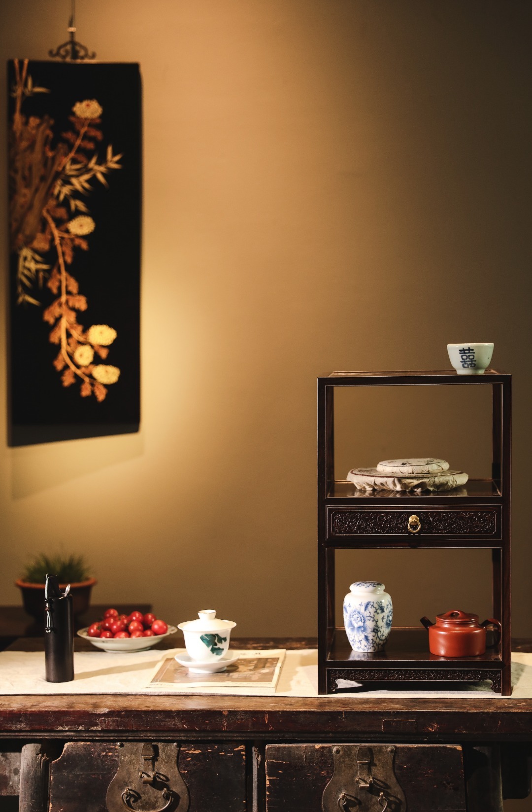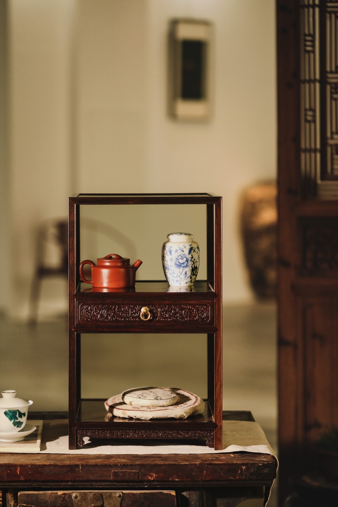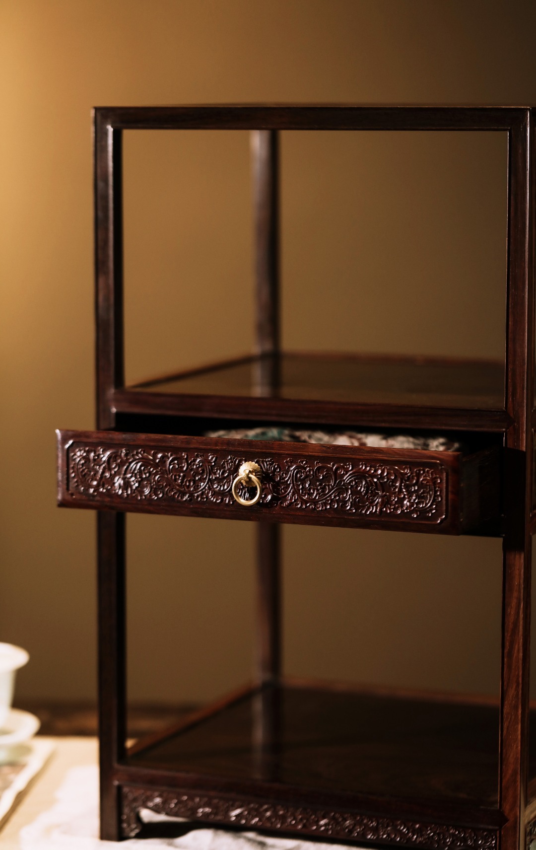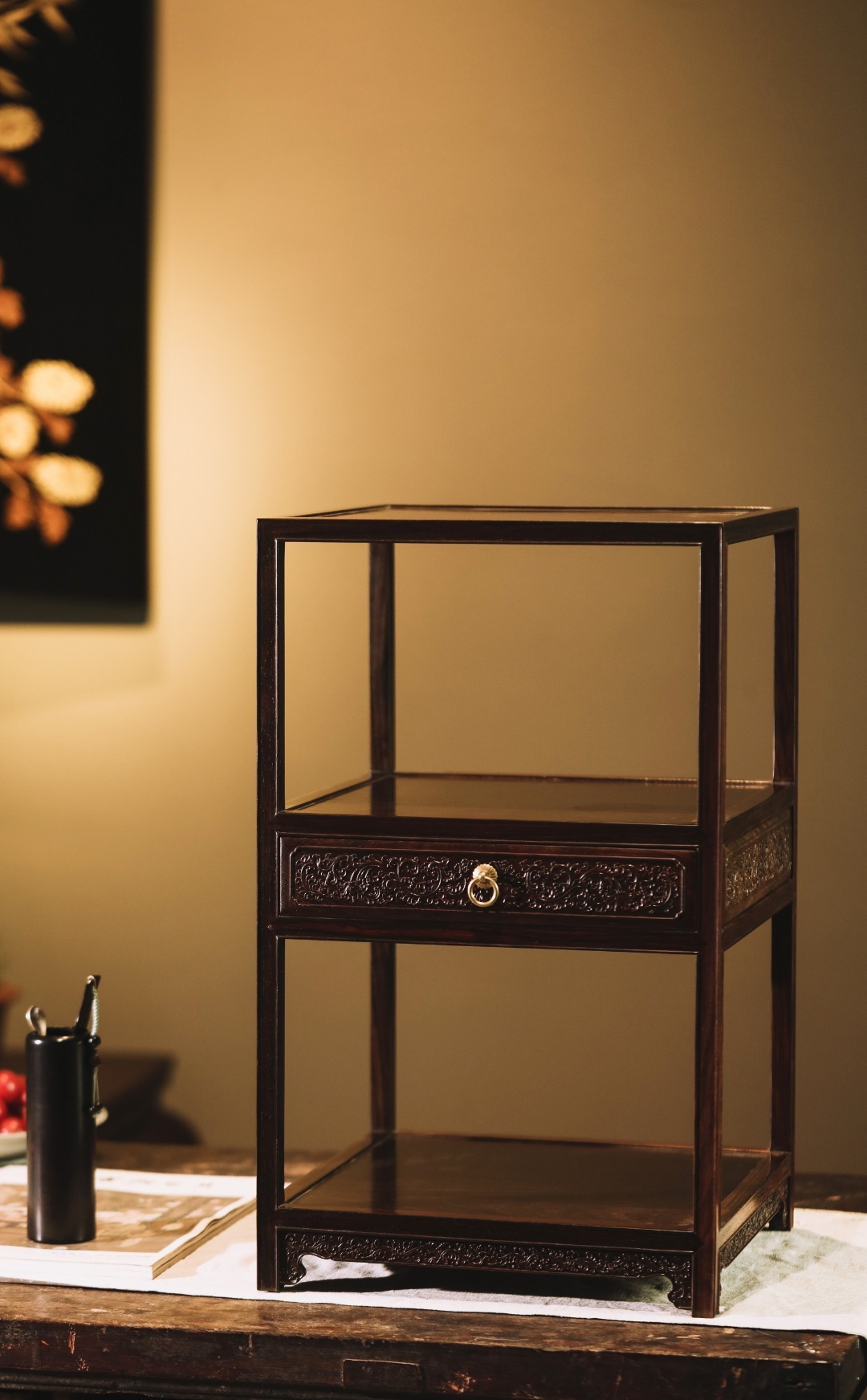 形制文雅精巧,工艺讲究,抱肩榫卯镶接严丝合缝,中设抽屉浮雕西番莲纹,寓意吉祥;置于案头,可置茶器、藏品、清玩、盆景雅石等,精致实用至上并兼文雅气质。