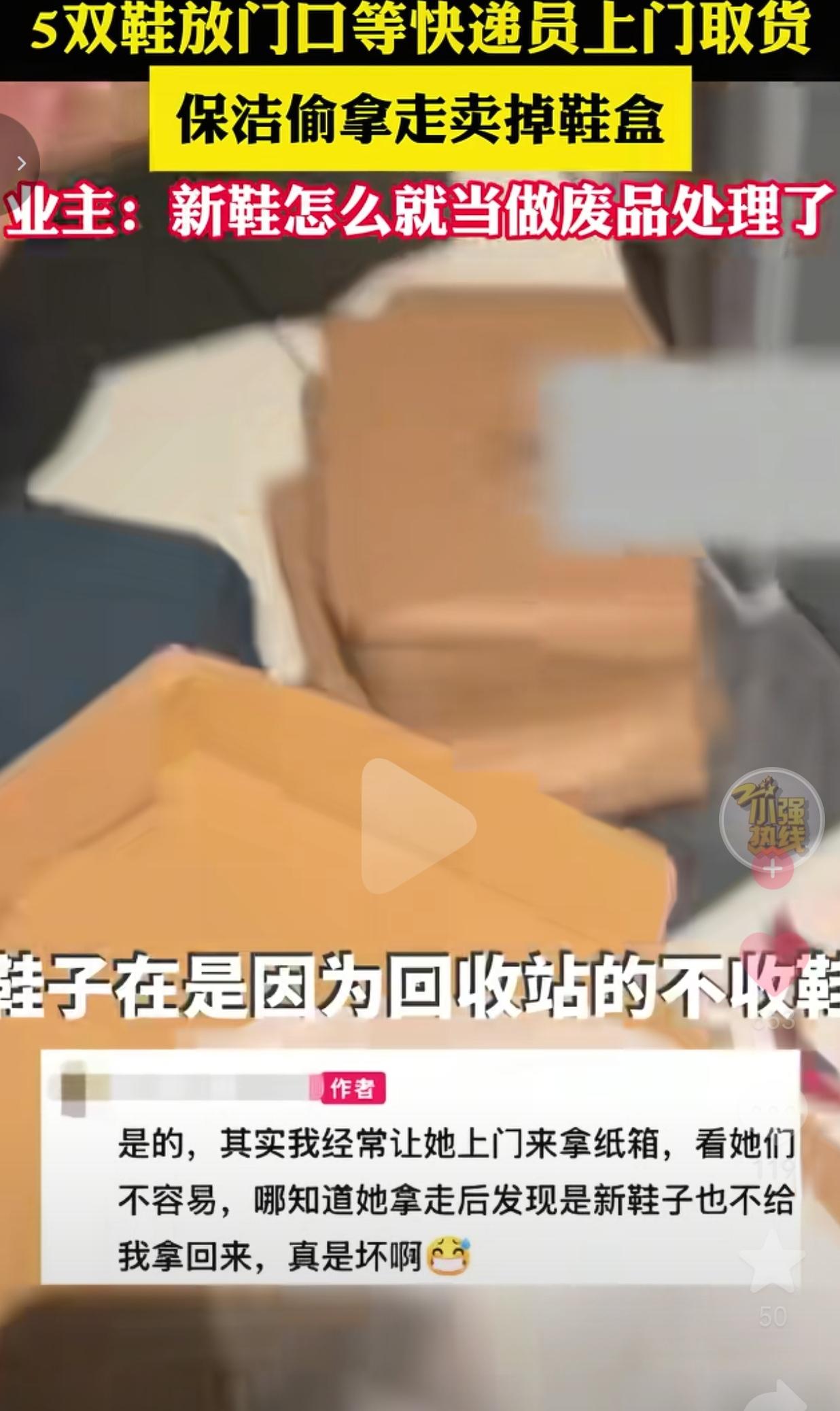 太气人了!我看完这个事,血压直接飙到180!这哪是保洁,这就是明晃晃的小偷!拿别人的东西卖钱,还理直气壮,真的太欺负人了! 重庆的辛女士,前阵子在网上特价场薅了一波羊毛,一口气买了好几双童鞋,留了几双合脚的,剩下5双不合适,准备退货退款。她特意把5双鞋连盒带鞋,整整齐齐放在自家门口,就等快递员上门取件。 辛女士平时就是个心软的人,看小区保洁阿姨不容易,经常主动把家里的纸箱给她拿,就想着能帮衬一把。可她万万没想到,自己这份善意,换回来的竟是得寸进尺的算计! 等快递员上门取件的时候,直接傻了:门口的鞋盒全没了!5双新鞋被拆得七零八落,散在地上,好好的原装鞋盒全被人拿走了!辛女士当场就懵了,赶紧调监控,一查气到浑身发抖——就是小区的保洁阿姨,趁没人的时候,把门口的鞋盒全给拎走了! 联系上物业找到这位保洁,她的话更是把人恶心透了!她居然说:“我以为是没人要的废品,就把盒子拆了卖了!” 合着人家好好的新鞋,连盒带鞋放在门口,你看不见?就算你眼睛不好使,把盒子当废品,那里面的新鞋你总看见了吧? 更离谱的是,她还振振有词:“鞋子没给你拿走就不错了,回收站不收鞋子,我才给你留下的!” 我的天!这是什么强盗逻辑?我放门口的东西,你凭什么动?你拿了我的鞋盒卖钱,还反过来觉得自己做了好事? 辛女士气到崩溃,好好的退货,没了原装鞋盒,商家直接拒收!5双新鞋,退不了货,钱也拿不回来,平白无故损失了小一千块! 她找物业协商,可保洁就一副“我穷我有理”的样子,拒不赔偿,物业也只会和稀泥,辛女士真的叫天天不应,叫地地不灵,太无助了! 最后她只能无奈表示,实在不行就协商赔个两三百,毕竟是特价场买的,159到179一双,养孩子太费钱,能省就省点,可这份委屈,谁看了不心疼? 网友看到后评论说:“这哪是保洁,这就是惯偷!平时拿人家纸箱拿顺手了,现在直接明抢了!必须让她原价赔偿,一分都不能少!” 也有的网友说:“太懂这种崩溃了!没鞋盒退货直接被拒,商家才不管你什么原因!这保洁毁了人家辛苦省的钱,必须让她赔!” 还有的网友说:“辛女士太善良了,平时还给她纸箱,结果养出个白眼狼!这种人就该开除,让她在行业里混不下去!” 也有的网友说:“物业干什么吃的?雇这种人当保洁,就是给业主添堵!必须物业承担连带责任,赔钱! 说实话,这件事最让我生气的,根本不是那几个鞋盒,是这个保洁阿姨骨子里的恶! 人家平时好心给你纸箱,你不感恩就算了,还盯着人家门口的东西,趁人不在就偷!明明看见里面是新鞋,还非要把盒子拆了卖钱,这不是贪小便宜,这就是故意的! 更恶心的是她的态度:偷了东西,不仅不道歉,不赔偿,还理直气壮,觉得自己没拿鞋子就仁至义尽了!合着在她眼里,只要没把鞋子拿走,拆人家盒子卖钱就不算偷?这是什么歪理邪说? 还有那个和稀泥的物业!业主花钱雇你,是让你保护业主财产安全的,不是让你给保洁当保护伞的!保洁偷业主东西,你不第一时间帮业主维权,反而和稀泥,让业主吃哑巴亏,这物业留着干什么? 最心疼的就是辛女士!本来开开心心退个货,结果平白无故损失了钱,还被人恶心一顿!她平时那么善良,总给保洁纸箱,换回来的却是农夫与蛇的故事!这份善意,被人踩在地上摩擦!更让人心酸的是,她明明是受害者,最后还要想着“能省就省”,只要求赔两三百,这份委屈,真的太戳人了! 我就想问一句:人穷,就可以没有底线吗?生活不容易,就可以偷别人东西吗? 别拿“保洁不容易”当挡箭牌!谁的钱都不是大风刮来的!你不容易,不是你偷东西的理由!你靠偷卖别人的东西赚钱,那就是小偷,就该为自己的行为付出代价! 最后我想说:善良要有锋芒,心软要分人!不是所有的“不容易”都值得同情,不是所有的“保洁”都配得上尊重!偷东西就是偷东西,别拿任何借口洗白! 也劝所有业主,千万别把贵重物品放门口!你的善意,在贪婪的人眼里,就是可乘之机!你的心软,只会喂饱那些白眼狼! 对此,你怎么看?