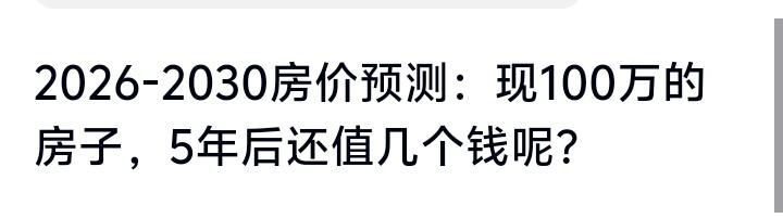2026-2030房价终极预言:你手中100万的房产,5年后是涨是崩?一线城市稳如泰山,三四线或血本无归!速看你的城市命运! (来源:子画大房子) 这几年的楼市风云变幻,让无数人夜不能寐。手握房产的人焦虑未来价值,无房者观望不敢下手。但真相往往藏在细节里,政策与市场的博弈早已悄然定调。 政策的风向标从未如此清晰。从中央会议到地方行动,稳楼市已成铁令。收购存量房、公积金改革、保障房推进,每一步都精准打击泡沫。这不是短期救市,而是长期重构。 市场分化正撕裂无数人的幻想。一线城市核心区依旧火热,人口与资源汇聚成护城河。而偏远城镇却陷入人口流失与库存压顶的泥潭。冷热之间,命运天差地别。 房子的价值终究逃不过供需法则。核心地段稀缺如金,自住投资皆稳妥。普通区域勉强保值,但想靠它发财已成梦话。至于那些空心化城镇,房产可能沦为负资产。 人性在楼市中暴露无遗。追涨杀跌的贪婪,踏空时代的恐惧,都在房价数字里翻滚。但真正能赢的,永远是看清本质的人——房子终将回归居住属性。 站在普通人的角度,这份焦虑太真实。攒钱半生换来的砖瓦,若贬值成砖头,谁不心慌?但情绪之外更要理性:你的房子在哪,决定了它的未来。 未来五年,楼市不再有普涨神话。有的只是残酷筛选。核心资产抗通胀,边缘资产变累赘。这不是预测,而是正在发生的现实。 读者朋友,你的房子属于哪一类?是稳坐钓鱼台,还是悬在悬崖边?欢迎评论区晒出你的城市和观点,一起吐槽探讨! 房价真相 买房攻略