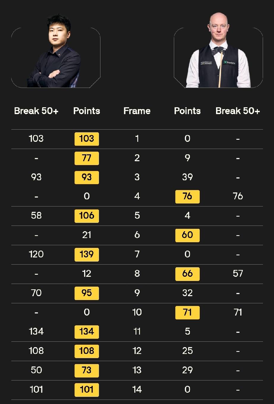 赵心童10-4击败克里斯·韦克林! 4月3日凌晨,斯诺克巡回锦标赛1/4决赛,赵心童对阵韦克林第二阶段比赛结束。 经过14局比赛的较量,赵心童以10-4的比分击败韦克林,晋级四强。 全场比赛,赵心童打出五杆破百!本赛季破百杆数达到73杆,位列第一。 第二阶段比赛,赵心童第表现是碾压式的!在双方各赢一局后,赵心童打出三杆破百一杆50+!连赢四局,带走了比赛的胜利。 半决赛,赵心童对阵塞尔比与希金斯之间的胜者。