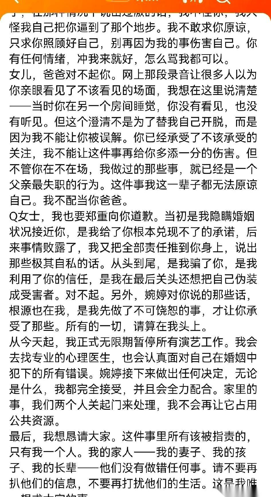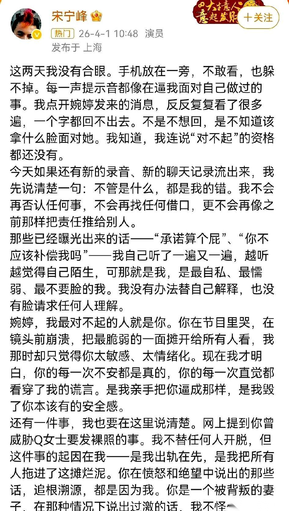 宋宁峰那篇道歉,一个字一个字拆开看,是真有意思。 他说自己羞愧到两天没合眼。 可日子一对,就对不上了。3月15号,张婉婷那边已经抓到人了,两口子还一起对小三放了狠话。结果呢?3月21号,他还在网上晒一家三口的幸福视频。 镜头里他笑得云淡风轻,那股子从容劲儿,哪有半点被人抓包的心虚,活脱脱一个刚度假回来的好丈夫、好爸爸。 他睡不着的那两天,不是因为羞愧。是眼瞅着对方要把事捅上网,自己饭碗要砸了,急的。 他又说,要“无限期暂停”所有演艺工作。 这话说的,好像他还有得选一样。这档子事一出,哪个剧组还敢递本子过来?这不叫暂停,这叫被动下岗。 更绝的是,他说要去看心理医生。轻轻一推,就把锅甩给了“心理疾病”,好像犯错这事,他也是个身不由己的“受害者”。 最后,他说,冲我来,别骂张婉婷。 可网上风向早就变了。大家骂的本来就是他。之前还说张婉婷“疯”的人,现在反倒回头嘀咕,“这疯劲儿,原来都是被他逼出来的”。 所以你看,整篇回应,看似滴水不漏,全是技巧。他不是在忏悔,他是在给自己的事业做最后的抢救。