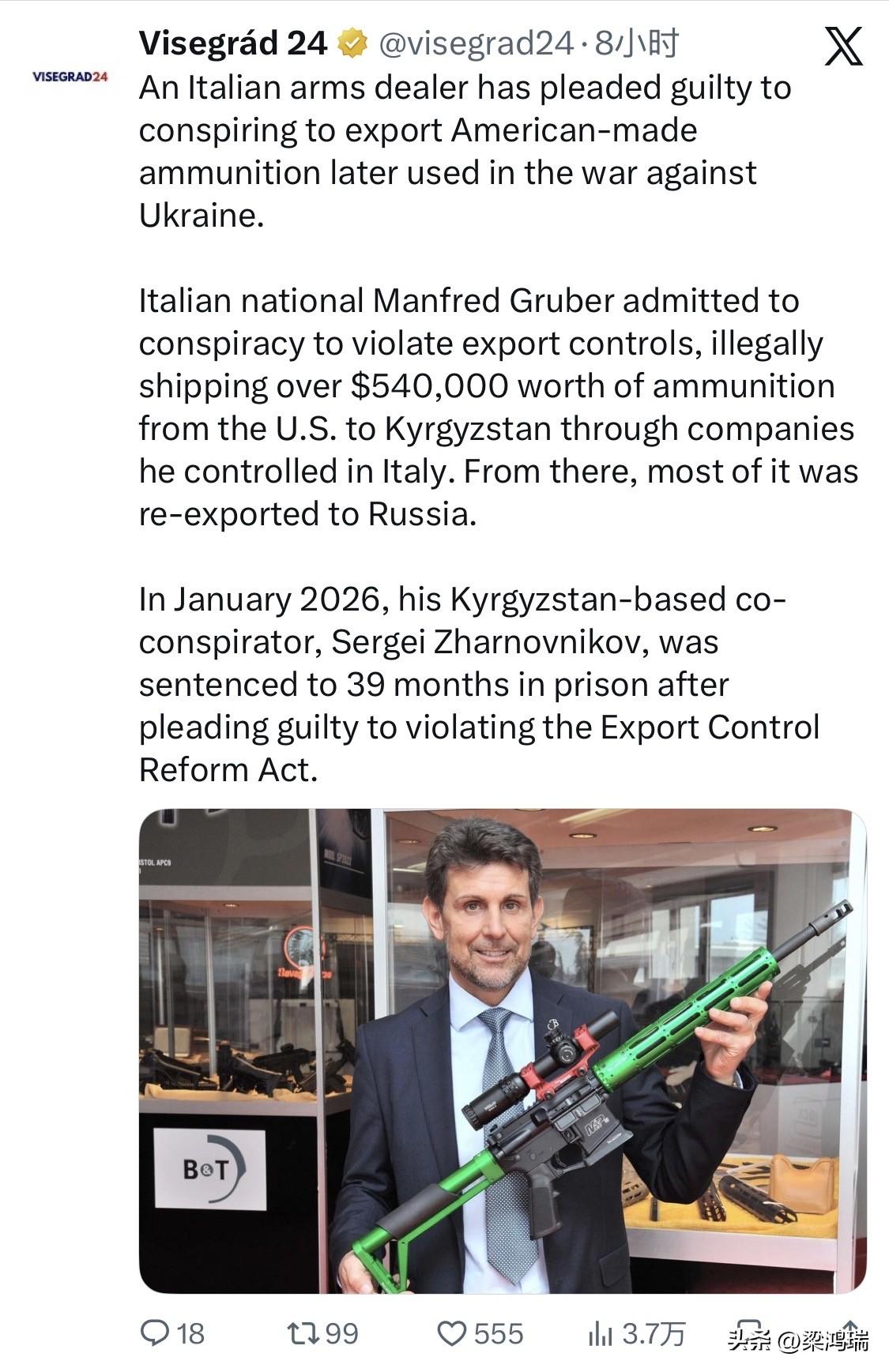 一名意大利军火商承认参与密谋出口美国制造的弹药,这些弹药后来被用于对乌克兰的战争。 意大利公民曼弗雷德·格鲁伯承认串谋违反出口管制,通过其在意大利控制的公司,非法将价值超过54万美元的弹药从美国运往吉尔吉斯斯坦。其中大部分弹药随后又被转运至俄罗斯。 2026 年 1 月,他的吉尔吉斯斯坦同谋谢尔盖·扎尔诺夫尼科夫承认违反了《出口管制改革法》,被判处 39 个月监禁。
