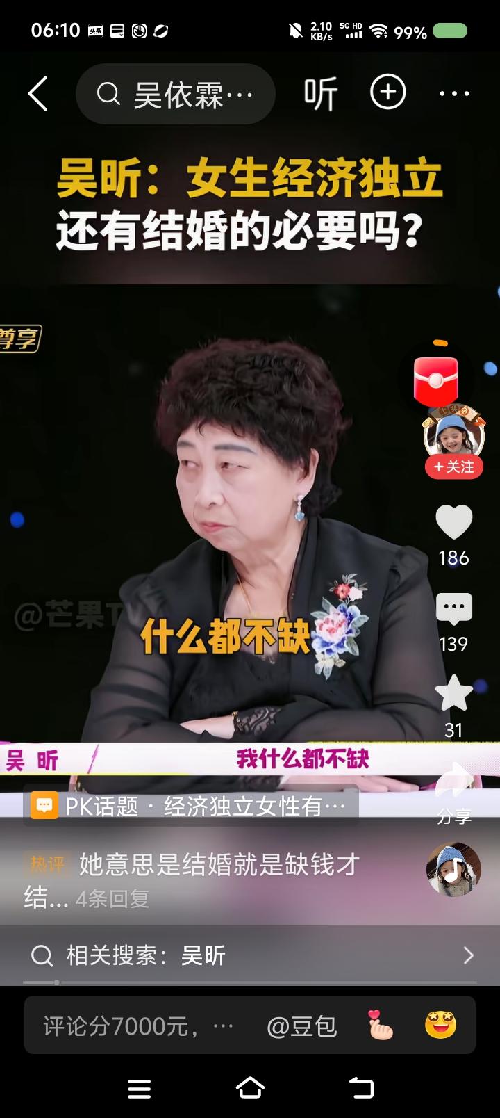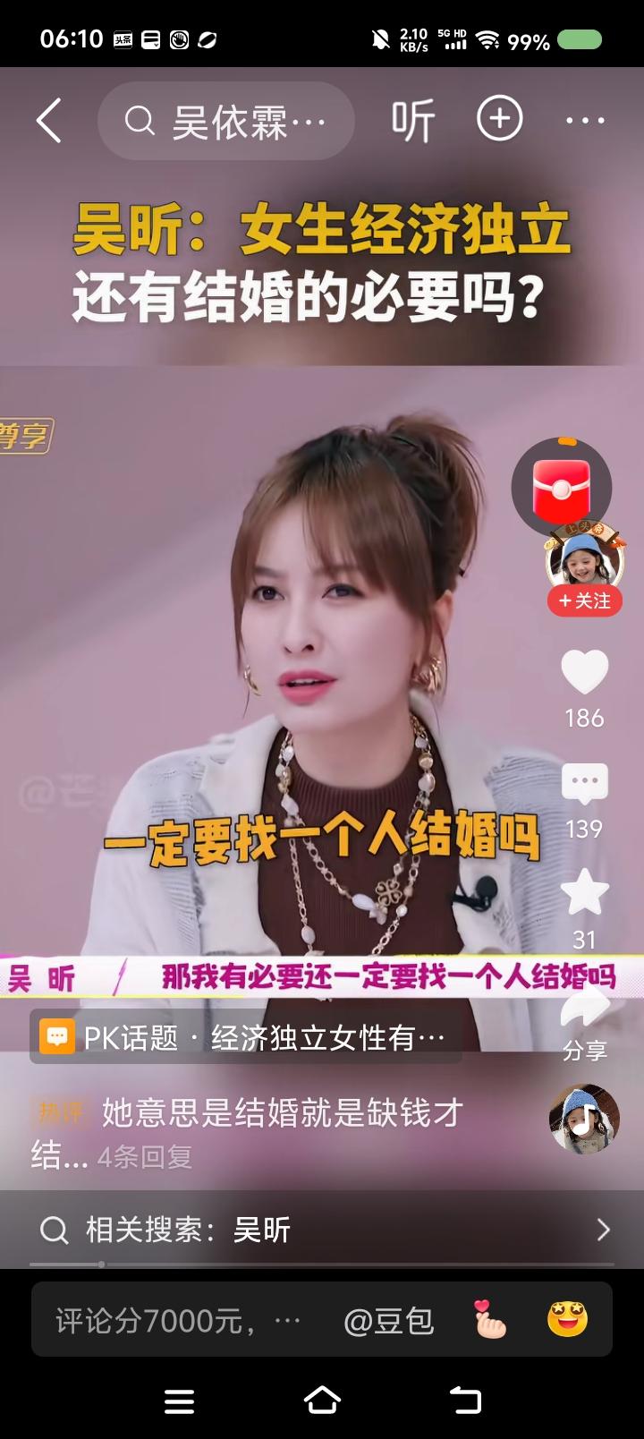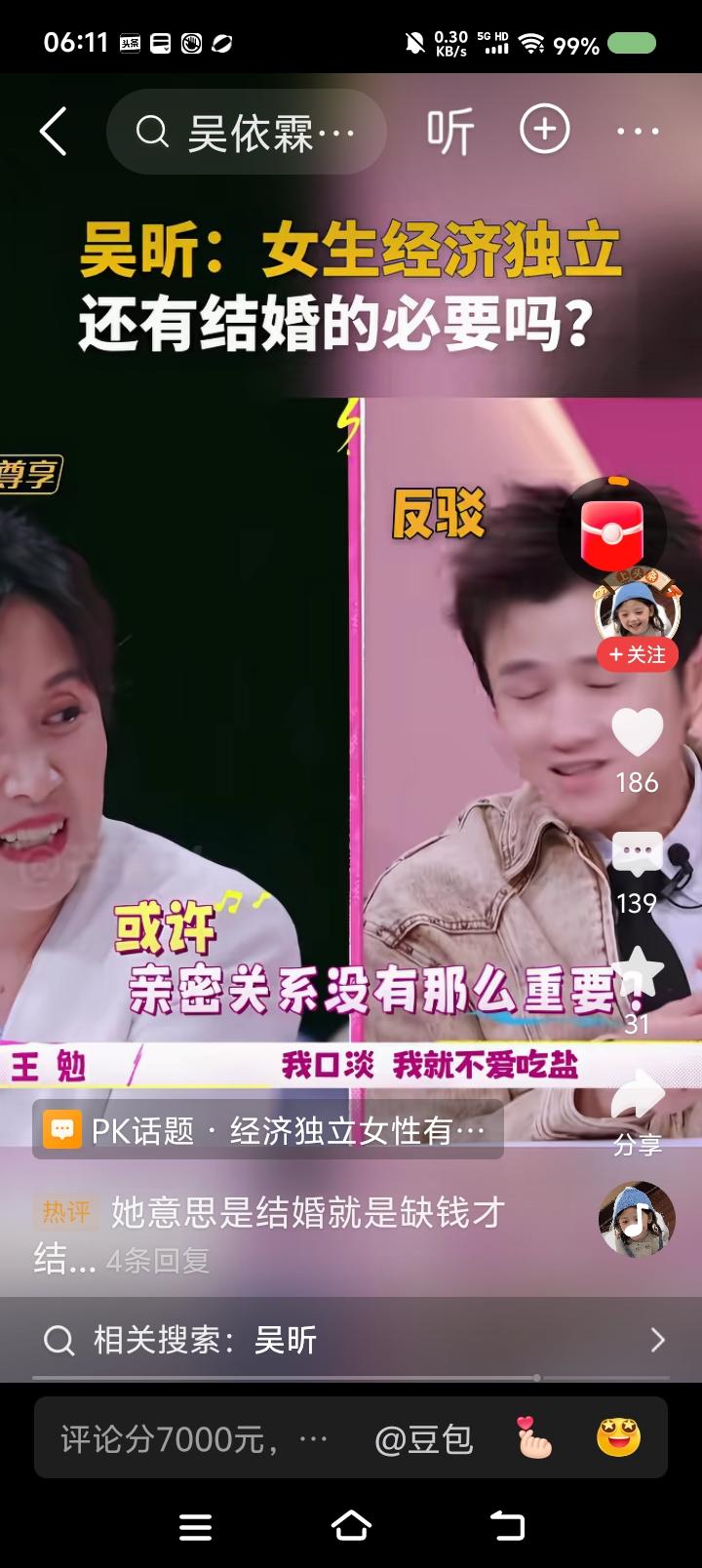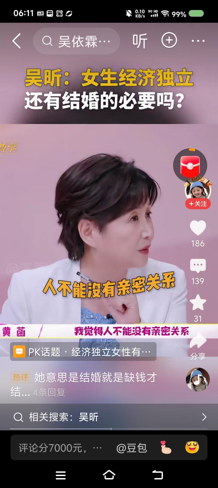有必要讨论这个吗?—— 节目里,某女子说:“我经济独立,什么都不缺,有必要结婚吗?”专家说:“人不能没有亲密关系,好像菜里不能没有盐。”某嘉宾说:“我口淡,不爱吃盐。或许亲密关系没那么重要。” 点评: 一、节目里,每个人的观点可能不是自己的立场。有台词,有预设立场,有调整,像直播的电视剧。 二、政府应为年轻人的婚姻提供便利:就业,房价,医疗,教育,养老,这“五大难”年轻人负担得起了,自然大都愿意结婚生育。人是社会的动物,独身主义不可能左右人类的未来。 三、至于个别人,爱结不结。你自个儿高兴,不伤害别人就行。专家说的“亲密关系”包括很多:生理的、精神的、灵魂的。情侣同居能跟婚姻一样吗?情侣养娃能跟夫妻养娃一样吗?你男朋友今天爱你明天说不爱了,你信不?你女朋友今天说与你一生一世明天敢说她与你不合适,你信么?