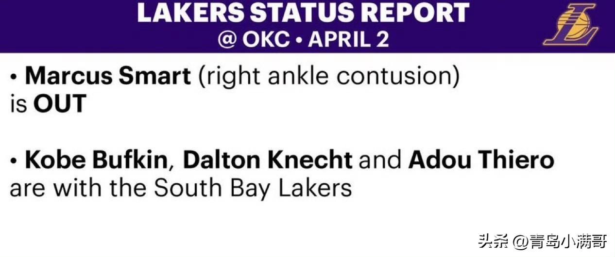 湖人伤病情况:斯玛特因为右脚踝挫伤将继续缺阵,而克内克特、巴夫金、蒂耶罗因为随南湾湖人打季后赛也纷纷缺阵。