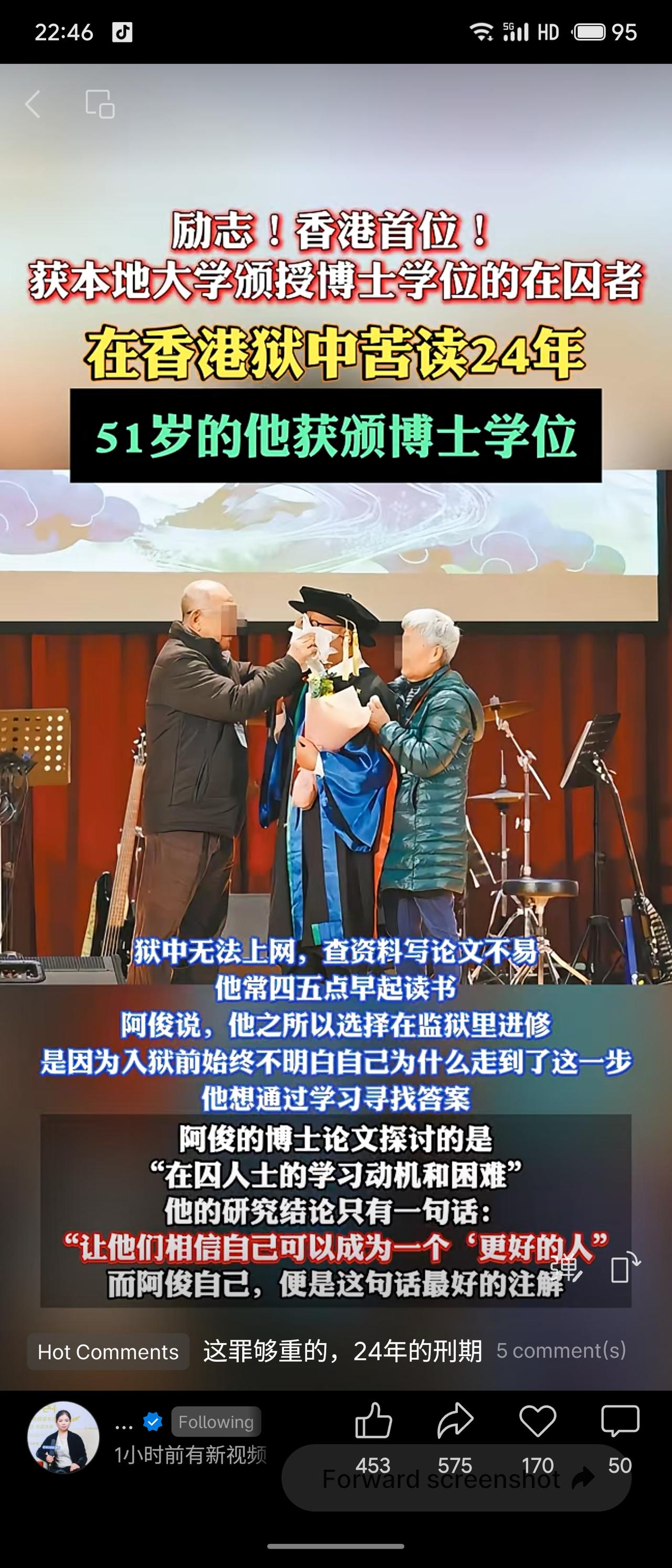香港在囚者阿俊,狱中苦读24年,51岁获都会大学教育博士学位,成为本地首位获此学位的囚犯。他因反思犯罪根源而求学,论文聚焦在囚者学习动机,结论是“让他们相信自己可以成为更好的人”。其经历彰显教育对人性重塑的力量,即便身陷囹圄,求知与自新之路亦能通向光明,令人敬佩。