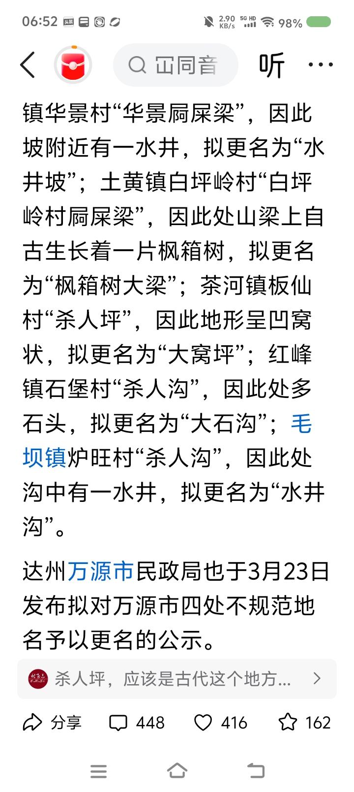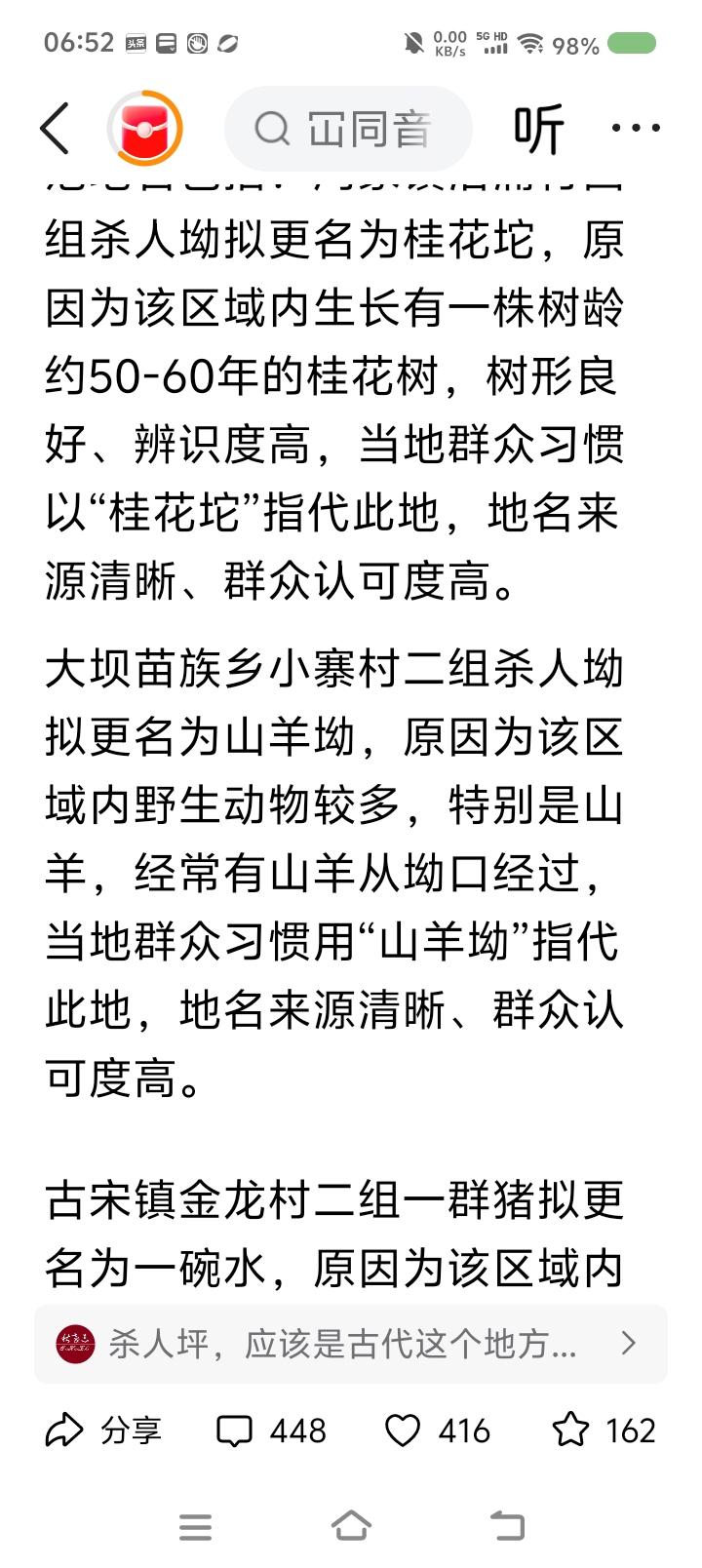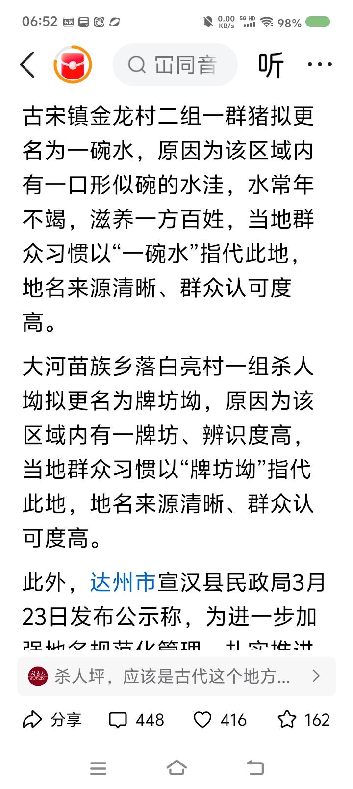 你支持改地名么?—— 据报道,四川多地清理不规范地名,比如“杀人坳”“一群猪”等等。 点评: 我能理解整治的理由,听着不雅,甚至影响形象,不利于经济发展、旅游。但有一些有历史价值,建议保留。 只要不是生僻字、易混淆、实在不雅的,尽量保留。 我一点不认为“杀人坳”吓人,我认为“寂静岭”更吓人。“一群猪”改为“野猪林”未尝不可。