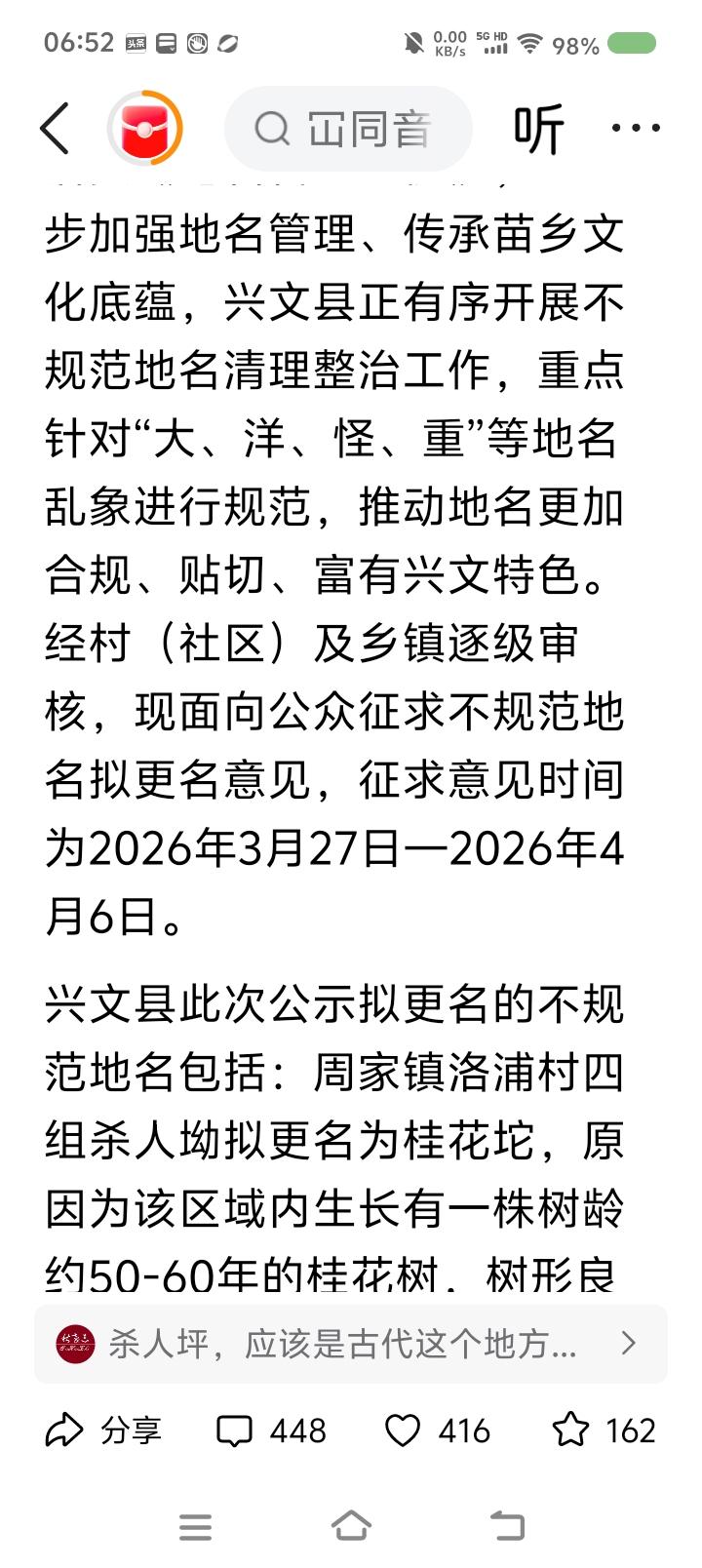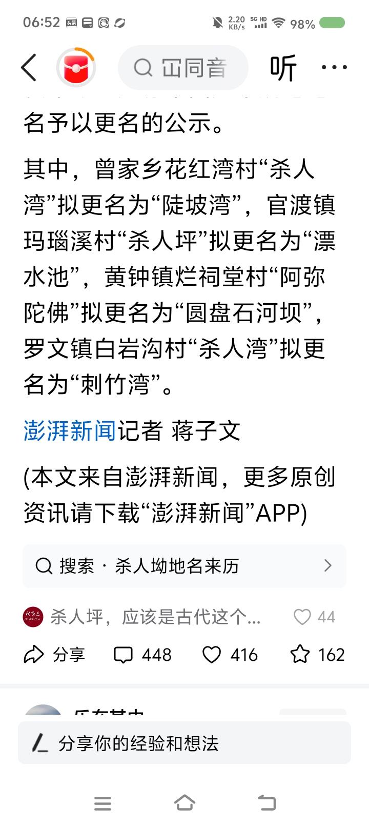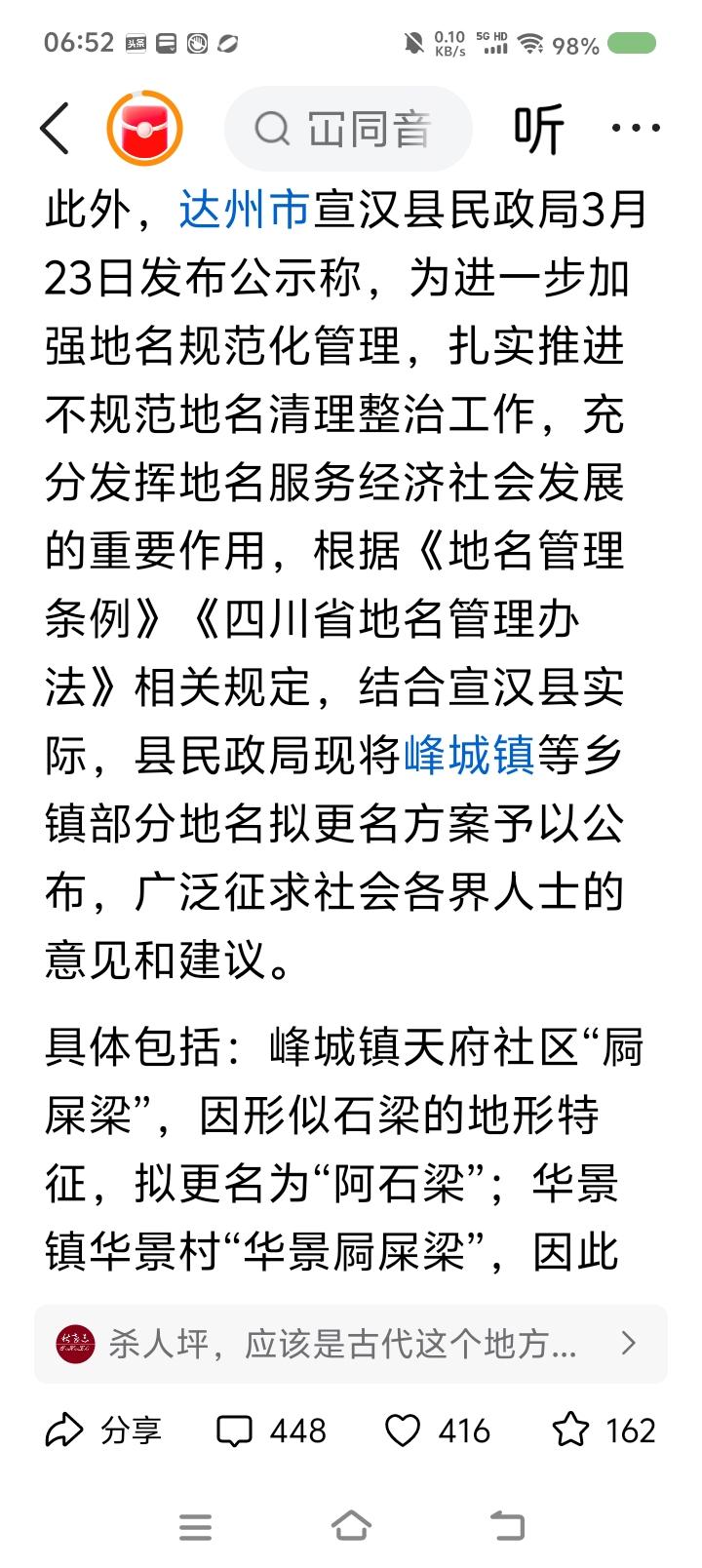 你支持改地名么?—— 据报道,四川多地清理不规范地名,比如“杀人坳”“一群猪”等等。 点评: 我能理解整治的理由,听着不雅,甚至影响形象,不利于经济发展、旅游。但有一些有历史价值,建议保留。 只要不是生僻字、易混淆、实在不雅的,尽量保留。 我一点不认为“杀人坳”吓人,我认为“寂静岭”更吓人。“一群猪”改为“野猪林”未尝不可。