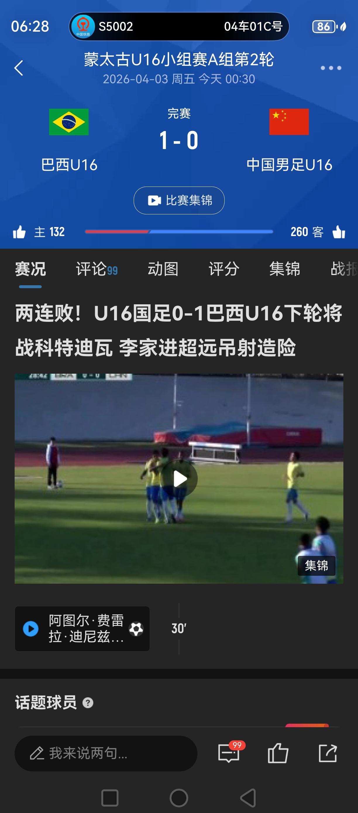 0:1,U16国少负巴西!预料之中的全场被围攻,但也有一两次很有威胁的反击攻门! 特别是李家进的超远吊射,很有威胁,也很有想象力!只偏一点儿,惊出对方门将一身冷汗! 身体,对抗,技术都不在一个层面,特别是中场,丢球特别多,特别快! 还是不适应高强度逼抢! 这种比赛锻炼价值极大!一场顶十场!得多参加! 另外说一句,旅欧小将的抗压能力明显就强一些! 还是要多送些人,早走出去!
