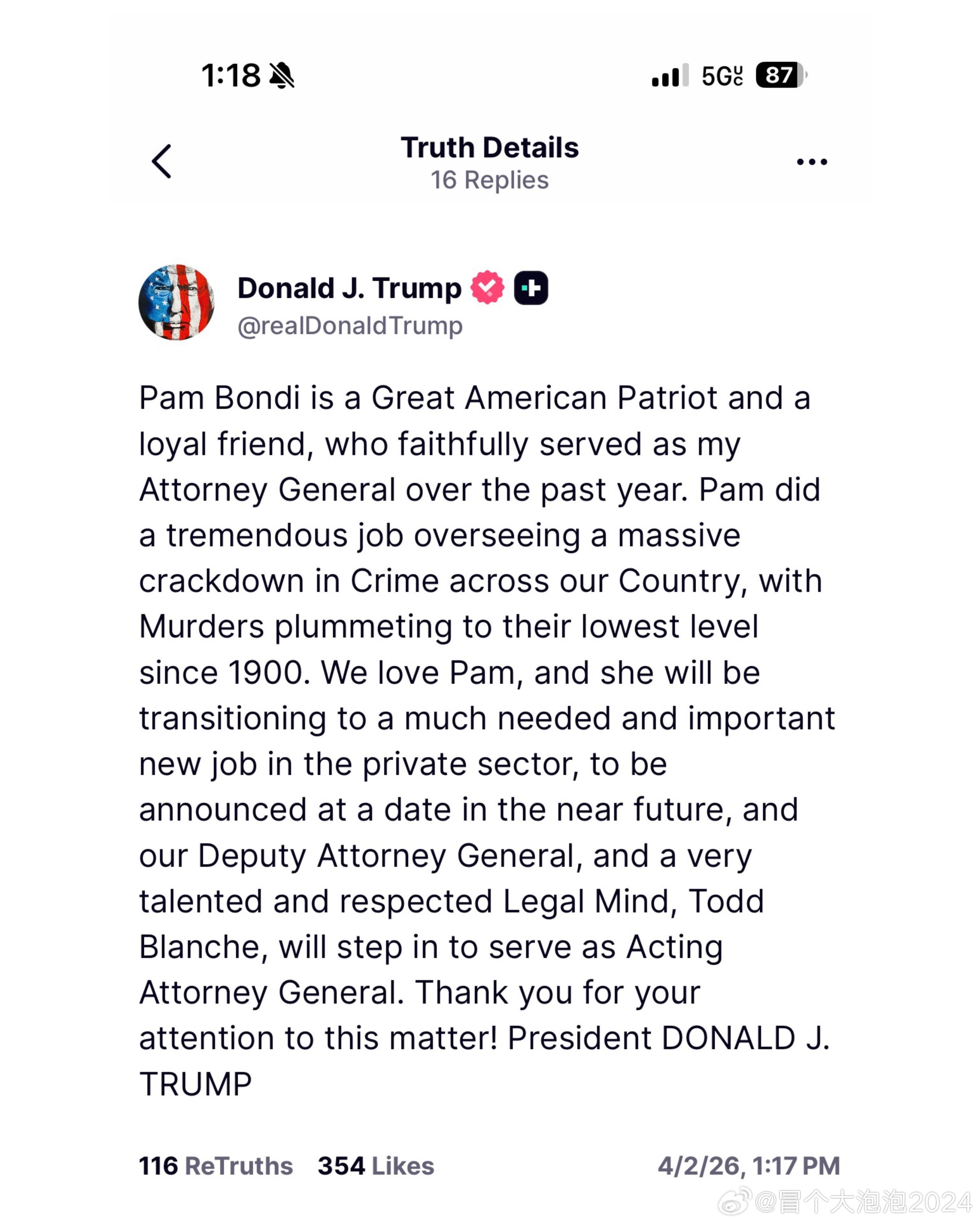 帕姆·邦迪是一位伟大的美国爱国者,也是一位忠诚的朋友,在过去一年里,她尽职尽责地担任我的司法部长。帕姆出色地监督了全国范围内的大规模打击犯罪行动,谋杀案数量骤降至1900年以来的最低水平。我们爱戴帕姆,她将转任私营部门一项至关重要的新工作,具体日期将在近期公布。届时,我们的副司法部长,一位才华横溢、备受尊敬的法律专家托德·布兰奇将接任代理司法部长一职。感谢您对此事的关注!唐纳德·J·特朗普总统