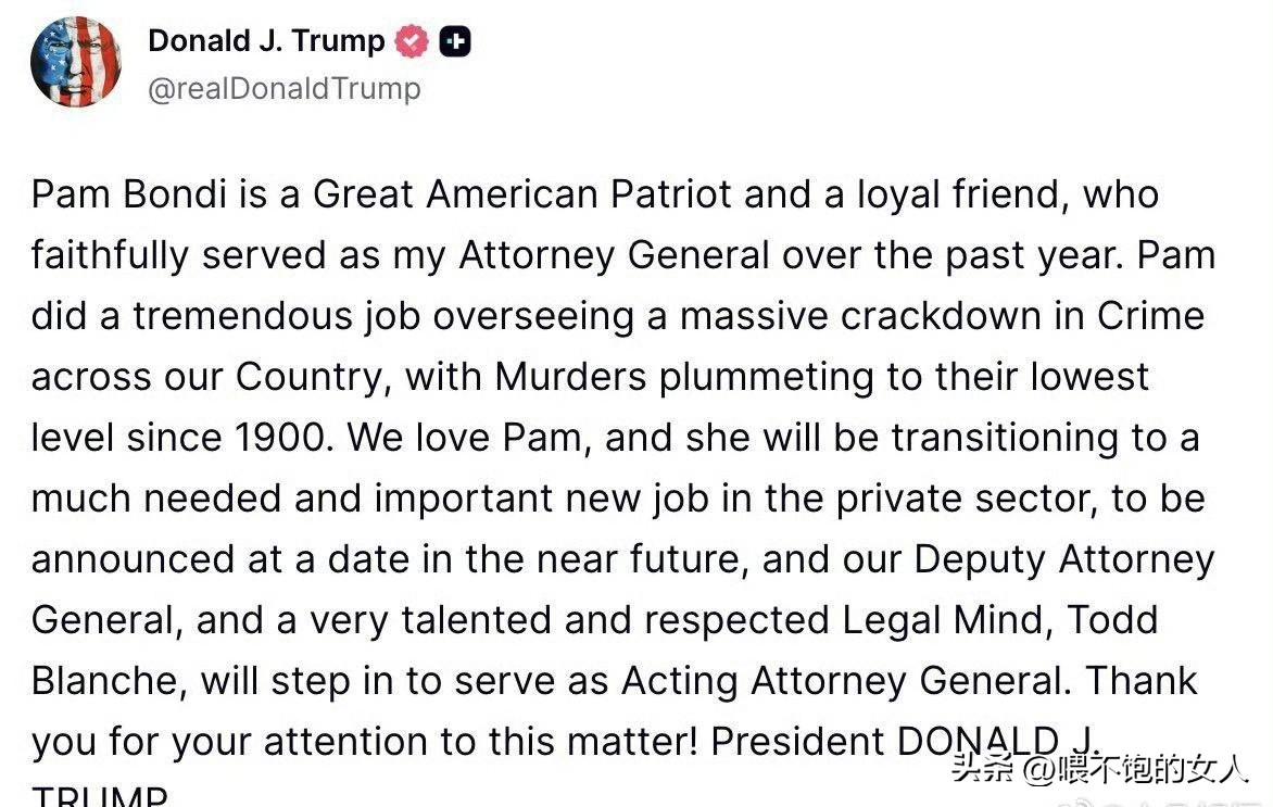 妈呀!这事儿是闹的! 川普把司法部长解雇了,还说了一大堆好话,还对于他成绩给予了肯定? 难道美司法部长被解雇不是因为爱泼斯坦文件公布之后,没达到预期吗? 难道不是美司法部长在打击政治对手方面做的不让川普满意吗?
