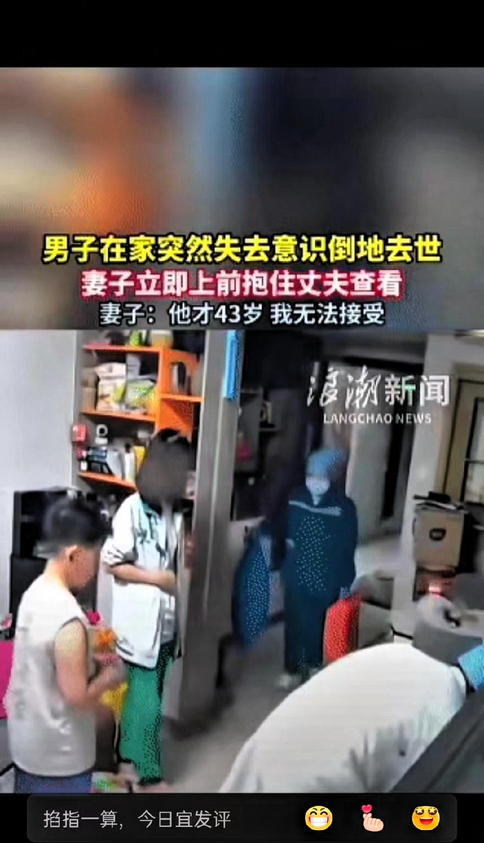 痛心!近日,广西,女子正躺在沙发上和丈夫、女儿闲聊。夫妻二人还像日常一样有几句简单拌嘴,本是再普通不过的家庭相处场景,却突然出现了意外状况。原本正常交谈的丈夫,毫无征兆地失去意识,瞬间没了回应。 妻子发现后,立刻起身来到丈夫身边,对其进行掐人中等紧急施救,同时让女儿第一时间拨打急救电话。当时丈夫已经无法自主站立,妻子便扶他躺在地上,将其护在怀中,焦急地等待医护人员赶来,全程满是无助与担忧。 尽管家人第一时间展开自救,医护人员也及时赶到进行救治,但最终还是没能挽回男子的生命,年仅43岁的他,就此与家人天人永隔。妻子难以接受这个事实,情绪彻底崩溃,这样的突发离别,对任何一个家庭来说,都是沉重的打击。 这起意外也让我们明白,生活从没有所谓的绝对安稳,我们总以为日子还长,总把忙碌当作借口,忽略了身体健康,也忽略了陪伴家人的时光。很多时候,意外不会给人任何准备的时间,看似平常的朝夕相处,或许就是最珍贵的时光。 43岁正值家庭责任最重的阶段,顶梁柱的骤然倒下,足以击碎一个家庭的平静。这也提醒着我们,平日里要多关注自身和家人的身体状况,不要过度透支健康,少些无谓的操劳,多留意身体发出的信号。 别总寄望于来日方长,认真过好每一天,珍惜陪伴家人的每一刻,守护好自己和家人的健康,才是最实在的生活。