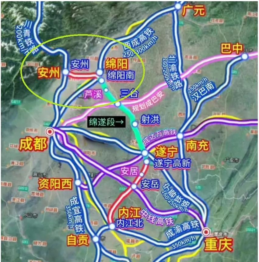 没有想到的是兰渝新高铁最终走的路线都没有选择这四条线路,而是利用川青铁路在绵阳接入绵遂铁路和在遂宁接入遂渝铁路,而且遂渝铁路还是时速350公里,而最失落的就是广元和南充了,作为普铁时代兰渝铁路的受益者,最终也没有争取到新线的线路走向。其实还可以利用宝汉巴南渝铁路或者兰汉十铁路和汉巴南城际铁路一样可以实现兰渝铁路的客运需求。但最近遂渝两地已经在推进落实兰渝新高铁走绵遂渝线路走向。