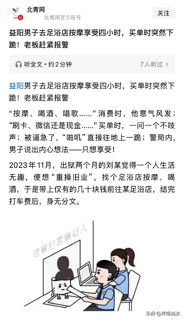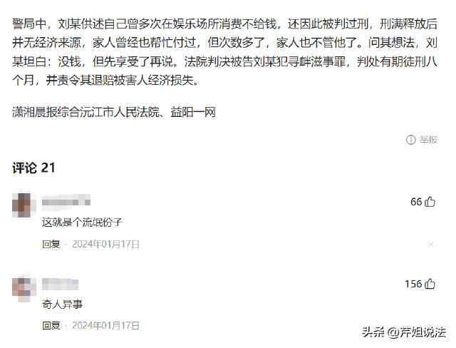 益阳,一男子刚从里面放出来,心想憋坏了就去足浴店潇洒一下吧。进店之后,先点了女技师给自己按摩,回头还泡了个脚,一番享受后还找了女店员陪自己唱歌、喝酒。看起来很潇洒,甚至有些意气风发,谁知道要买单的时候,老板准备找他要钱,男子突然“扑通”一声下跪,求老板放过自己,因为他没钱结账。 老板也是气死了,白白让他享受了4个小时,老板毫不犹豫的就报了警。 (本案例参考来源:北青网) 一男子刘某,被送进去之后,一直很向往出来之后的生活。 终于有一天,刘某被放了出来。出来两个多月后,刘某也没有找到工作,成天游手好闲、无所事事。 因为两兜空空,而且感到生活非常无趣,刘某就想要“重操旧业”了,想要找个娱乐场所消遣一下。 事发当天,刘某路经一家足浴店,这个对于他来说,非常有吸引力,因为里面可是有不少的娱乐项目啊。 只不过,刘某的身上,也就几十元,当时打完车、结完账之后,刘某就真的身无分文了。 不管有钱没钱,刘某还是踏进了足浴店的大门。 进店之后,刘某跟店员讲,一定要来个大包厢,他要放松一下。 店员还以为来了大客户呢,真的就给刘某安排了包厢,还安排了女服务员入内伺候。 之后刘某又继续点了4个小时的泡脚加按摩的服务,真的是彻彻底底的放飞自我了,十分的享受。 泡完脚、按完摩,刘某又继续点单,点了烟酒、花生、瓜子等各类小吃,还喊了女店员陪伴,一整个出手阔绰。 而服务员看到刘某点的单子比较大,按照以往的经验,万一这个人最后付不起账单,那就尴尬了。所以服务员赶紧汇报给老板。 刘某看到老板过来,也掏出了一张银行卡,表示自己最后会刷卡的! 当然,老板也暂时的相信了,之后刘某就继续拿起话筒,尽情唱起歌来。 潇洒完毕,刘某也彻底虚脱了。这个时候,老板走进来,要求刘某到前台去买单结账。 而这个时候,其实刘某已经很心虚了,内心有些紧张。 来到前台之后,老板则守在一旁,就看刘某是否可以支付的起。谁曾想,刘某直接“扑通”一声下跪,说自己没钱了,不断的找老板求情。 而足浴店的老板可不是吃素的,他看得出来眼前这位顾客,就是想要吃“霸王餐”了,拿出手机就报了警。 不久之后,办案人员也过来,及时将刘某给带离调查。 原来,刘某之前就因为这个事情被送进去,啥事呢?也是沉迷于娱乐场所,但是最后没法付钱,因此被判了刑。 这次出来之后,刘某没工作,也没有经济来源,所以就想着重操旧业,看来他的“瘾”啊,可真大啊。 一开始家人还愿意给他点钱,帮他点忙,后来次数多了,刘某屡教不改,家人也都不想管他了。 最后,刘某被判处有期徒刑8个月,并且责令其赔偿被害人经济损失。 看看这个案子,刘某其实就是个无赖,以为下跪求情就可以解决问题吗,其实他已经涉及“恶意消费、强拿强要”了,扰乱了正常的秩序。 根据《刑法》第二百九十三条规定,多次恶意逃单,短时间内频繁犯案,故意高消费却无法支付,可能构成寻衅滋事罪。 如果说单次逃单,并且费用比较小,仅此一次,则可能构成《治安管理处罚法》的相关规定,涉嫌治安违法。 一般这样小程度的违法,办案人员会调解或者单方面处以行政拘留,也不至于入刑。 但是像刘某这种,他已经属于多次犯罪了,而且还有前科、有记录,甚至进店后不断高消费,明知道自己没有能力支付,却仍然继续肆意消费,构成了多次恶意逃单。 结合刘某之前有前科、再犯,极有可能这一次会被依法从重处罚,被判入刑具有正当性。 很多类似的情形,如明知无能力消费仍然故意消费、不特定店家多次实施、被处罚之后仍然不知悔改、造成店家经济损失秩序混乱,等等。 如有这类情况,“吃霸王餐”已从“小恶”演变为“大恶”,单处行政处罚不足以惩戒,必定要动用刑罚手段。 所以说,像刘某这种人,不仅不道德、无素质,更多的是已然违法,必定要被法律给制裁。 对于此案,大家都怎么看呢,欢迎评论区评论留言。