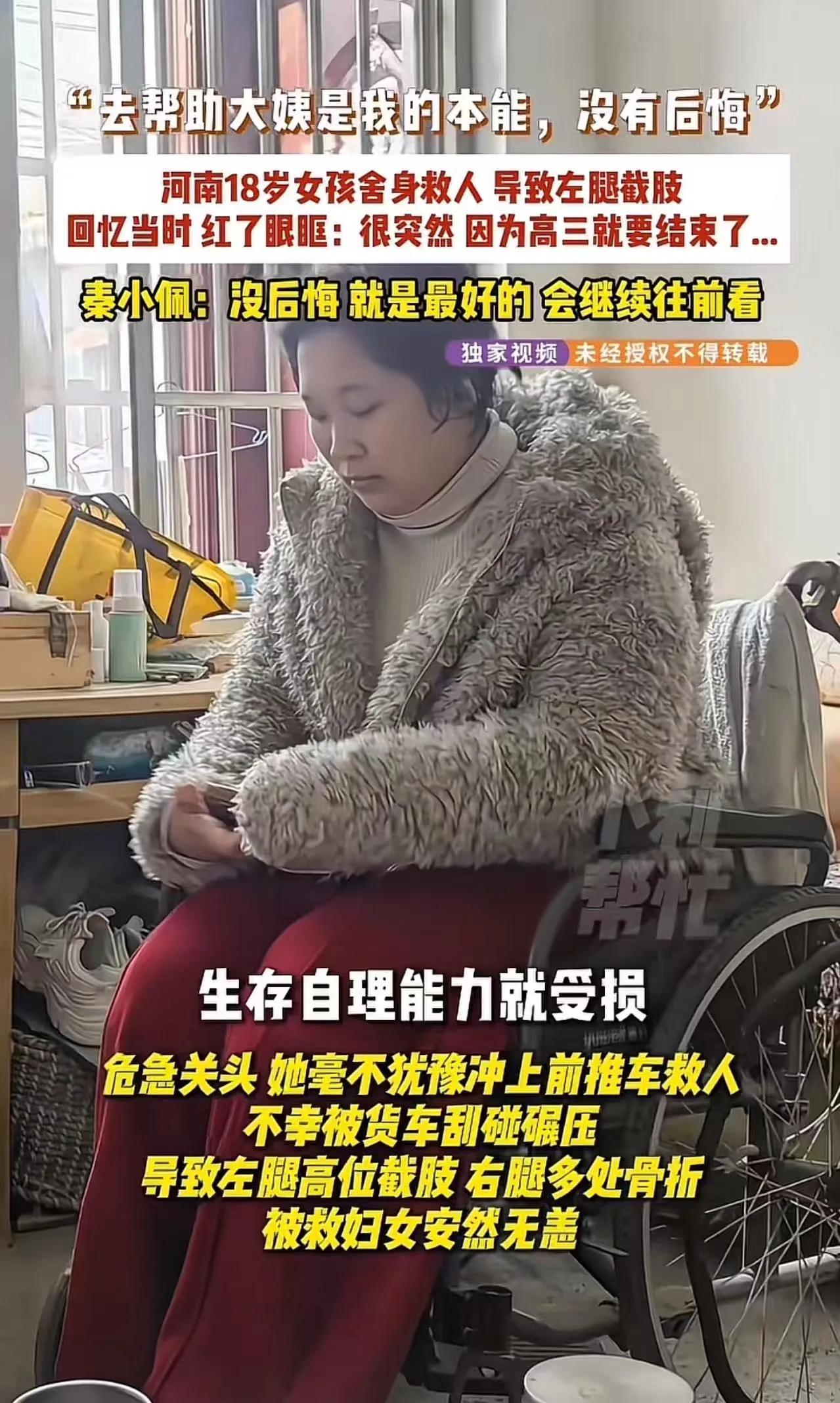 事件回顾:河南18岁女孩秦小佩舍身救人 这位女孩是河南上蔡县二高的学生秦小佩(2007年生) 。 事发经过(2025年3月7日) : - 放学在车站等父亲,见一位大姨推三轮车上坡失控,滑向货车。 - 她本能冲上去推车,大喊“大姨快躲开”。 - 货车与三轮车碰撞,她被碾伤,左腿高位截肢、右腿4处粉碎性骨折 。 - 被救大姨安然无恙。 她的心声:无悔,向前看 - “一条腿换一条命,我没有后悔。” - “去帮助大姨是我的本能。” - “我会坦然接受,继续往前看!” - 回忆时红了眼眶,但语气始终坚定。 近况与荣誉 - 经历7次手术,现已坐轮椅重返校园备战高考。 - 获评:上蔡县见义勇为先进个人 、中央政法委2026年第一季度见义勇为勇士 。 - 梦想:考上北师大,当一名老师 。 评价 这是刻在骨子里的善良与勇敢。18岁的选择,用沉重代价诠释了“本能大爱”,值得所有人致敬。河南救人少年 十三岁男孩救人 高中生救人事迹 学生救人事迹 素材取于网络
