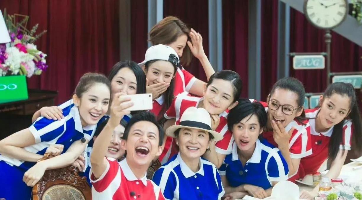 哇哦,这张照片真是靓女云集哟: 一眼就认出了林青霞,朱茵,谢娜,杨玉莹,戴着眼镜的宁静,玉手捂嘴的赵丽颖,当然还有开怀大笑的何炅老师,最后那位兰手轻扬的短发女神是蔡少芬吧?