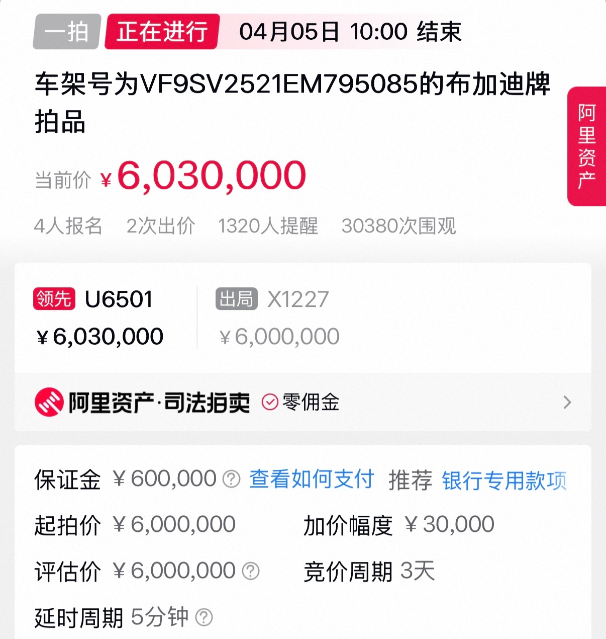 4人报名,2次出价,应该不会流拍了。虽然车况不明、手续作废,但600万肯定是值得