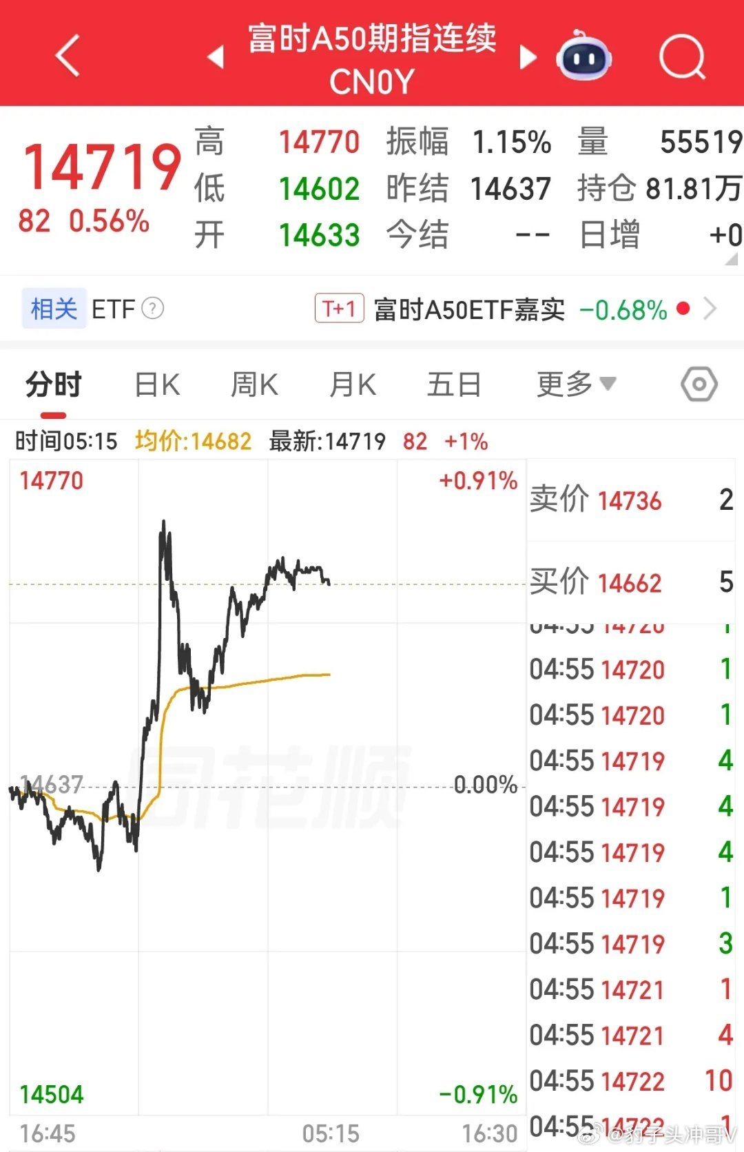 富时中国A50指数期货夜盘收涨0.56%,报14719点。