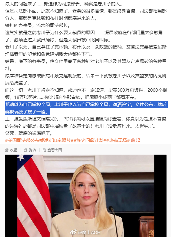 美撤换陆军参谋长特朗普解职美司法部长邦迪烽火问鼎计划 司法部长邦迪被解雇,特朗普开始了第二次“内阁杀”!二月的时候,我还特意写了,爱泼斯坦文件爆发,不是市场上所谓的以色列搞老川子,是它老川子自己以为自己掌握了局面,签署法案公布了爱泼斯坦文件。结果,司法部办事的里面很多深层触手,直接在里面塞了远超以往的老川子黑料。而这些文件按道理流程,邦迪要审查的,但它估计也没有想到,底下人这么坑自己。最终就出现了老川子签署法案曝光自己在爱泼斯坦方面的尴尬。而审核文件是司法部的活,曝光了老板的黑料,邦迪作为第一责任人是跑不了的。老川子还真是有闲心,中东与伊朗的战争打成这样,还有闲工夫去找内阁的麻烦!