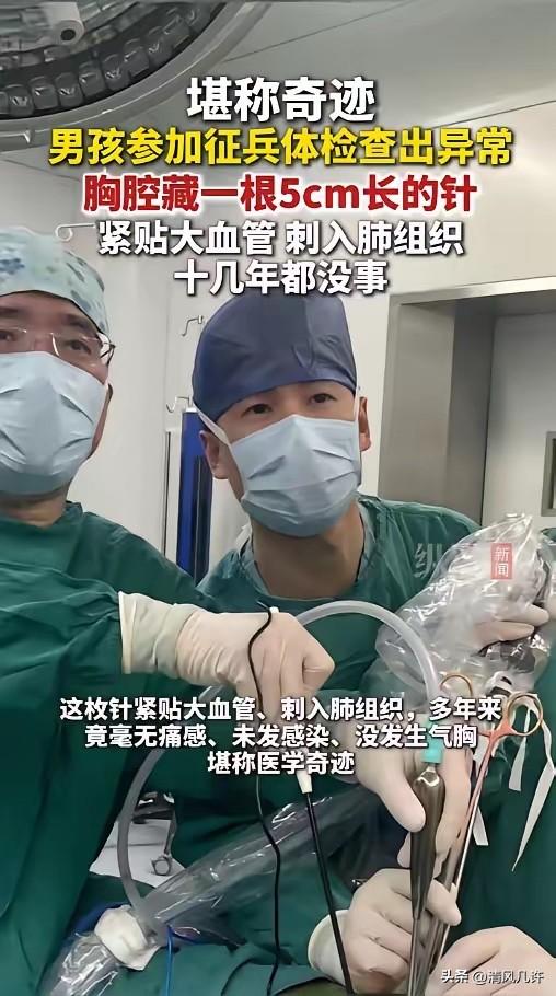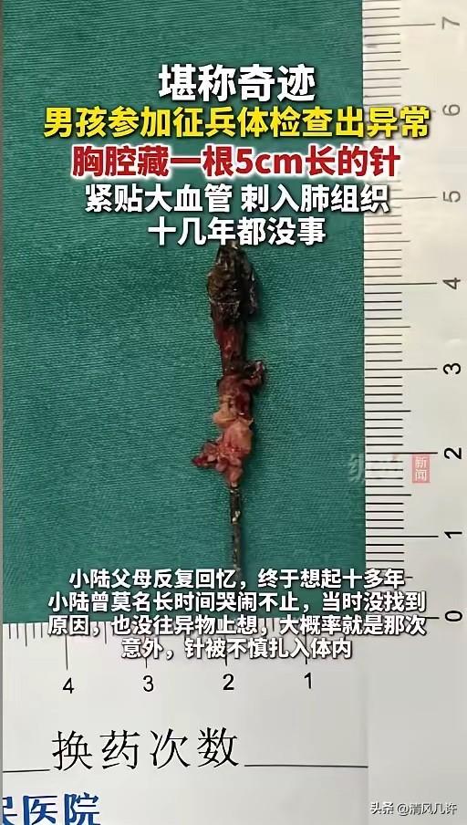 “命真大啊!”近日,一位17岁少年满心欢喜的去报名参军,可体检的时候却出了问题,医生通过影像发现,他的胸腔有一片明显的金属阴影,竟是一根缝衣针。它紧贴着大血管,还刺入了肺组织,离奇的是,人竟然什么事都没有! 少年名叫小陆,老家在安徽,从小跟着父母在浙江嘉兴生活,当时正准备从职高毕业,满心都是参军入伍的梦想。体检胸片出来的那一刻,在场的医生都倒吸一口凉气。 进一步CT检查确认,这根长达5厘米、锈迹斑斑的缝衣针,斜插在肺组织深处,针尖紧紧贴着胸主动脉、上腔静脉这些人体最核心的大血管。只要针体发生哪怕一毫米的位移,都可能直接刺破血管,引发致命性大出血,后果不堪设想。 更让所有人震惊的是,小陆长到17岁,从来没有出现过任何相关不适。 没有胸痛,没有咳嗽,没有感染,连气胸这种最基础的并发症都没发生过,十几年的时间里,这根针就像凭空消失了一样,完全没影响他的正常生活。接诊的心胸外科医生直言,这种情况堪称医学奇迹,能平安活到现在,完全是不幸中的万幸。 小陆和父母得知这个结果,当场就懵了。他们完全想不起来,这根针到底是什么时候、怎么进入体内的。一家人反复回忆,才终于想起十多年前的一件事。 当时小陆还是个几岁的幼童,有一段时间突然莫名长时间哭闹不止,怎么哄都没用,父母带他去检查,也没查出任何问题,只当是孩子闹脾气,没往体内有异物上想。现在回头看,那次哭闹,大概率就是针体不慎扎入体内时,孩子发出的求救信号,却被所有人忽略了。 医生立刻给小陆安排了手术,这根针的位置太凶险,手术难度极高,容不得半点失误。术中可以看到,针体已经被周围的肺组织完全包裹,形成了稳定的粘连,这也是它十几年没移位、没引发严重后果的关键原因。 医生小心翼翼地分离粘连组织,用专用器械稳稳夹住针体,全程精准操作,没有碰到周围的大血管,最终完整取出了这根藏在体内十余年的“定时炸弹”。取出的针体完好无损,连针眼都清晰可见,长度足足5厘米,锈迹已经深入针体。 手术非常成功,创伤小、出血少、用时短,术后小陆恢复得很顺利,没多久就康复出院了。 困扰他十几年的隐患彻底清除,他也终于能放下心来,重新规划自己的人生。这件事传开后,无数网友感慨,这孩子真的是命大,也有人后怕,要是没有这次征兵体检,这根针不知道还要在他体内藏多久,万一哪天运动、摔倒导致针体移位,后果不堪设想。 这件事给所有家长都敲响了警钟。幼儿阶段的孩子自我表达能力弱,很多时候身体出现异常,只能用哭闹来表达。 家长一旦发现孩子有不明原因的持续哭闹、不适,一定要重视起来,全面排查原因,不能简单归结为孩子闹脾气,错过最佳的干预时机。尤其是家里有缝衣针、别针这类细小尖锐物品,一定要妥善收纳,放在孩子接触不到的地方,避免发生类似的意外。 很多人会疑惑,为什么这么大的异物在体内,孩子却完全没有感觉。 其实人体有很强的自我保护和适应能力,当异物缓慢进入体内,周围组织会逐渐形成包裹,把异物隔离起来,减少对身体的刺激,时间久了,人体就会适应这种状态,不会出现明显的症状。但这绝不代表异物没有危害,它就像一颗随时可能爆炸的炸弹,一旦受到外力冲击、体位剧烈变化,就可能移位,引发致命危险。 这次能发现隐患,完全是因为征兵体检的严格筛查。如果不是小陆有参军的想法,主动去做了全面体检,这根针可能会一直藏在他体内,成为一辈子的隐患。这也让我们看到,定期体检、全面筛查的重要性,很多潜藏在体内的疾病、异物,在没有症状的时候,很难被发现,只有通过专业的医学检查,才能及时排查风险,守护身体健康。 小陆的经历,是不幸,也是万幸。不幸的是,一根针在体内藏了十几年,时刻威胁着生命安全;万幸的是,在最危险的时刻,通过一次体检发现了隐患,并且顺利手术取出,没有造成不可挽回的后果。 这件事也让我们明白,健康无小事,任何一点疏忽,都可能酿成无法挽回的悲剧,只有时刻警惕,重视身体发出的每一个信号,才能真正守护好自己和家人的健康。 各位读者你们怎么看?欢迎在评论区讨论。