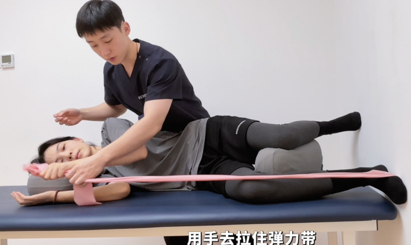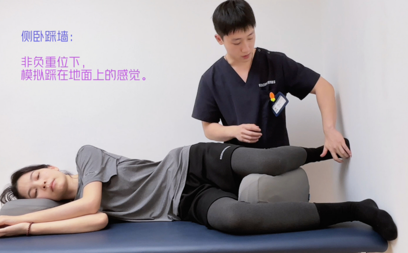 (1)侧卧位,膝盖夹住枕头,足部踩住墙面。a、如果在走路、跑步、上下楼梯支撑落地时疼痛,训练腿放在前侧b、如果在走路、跑步蹬地时疼痛,训练腿放在后侧