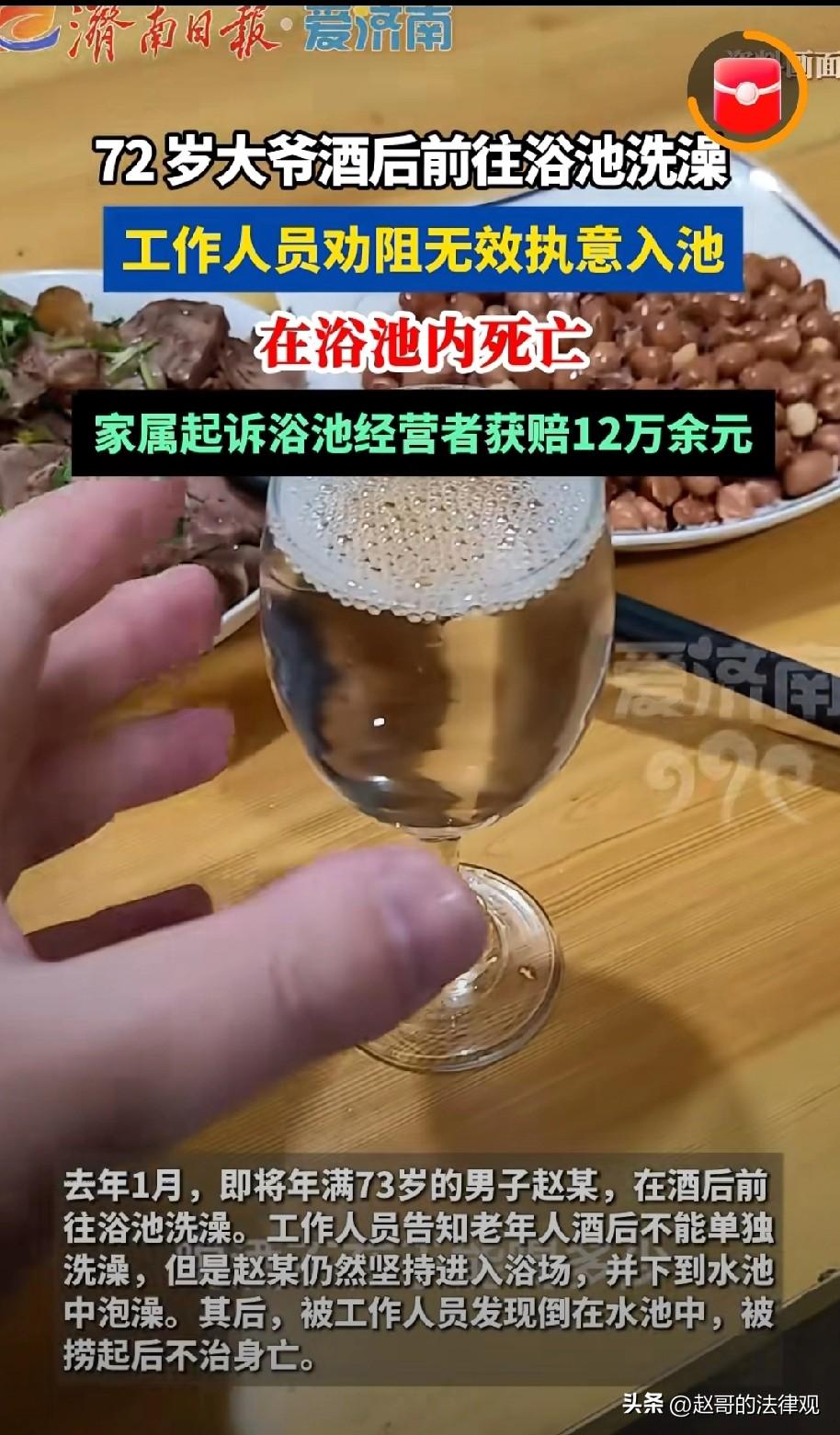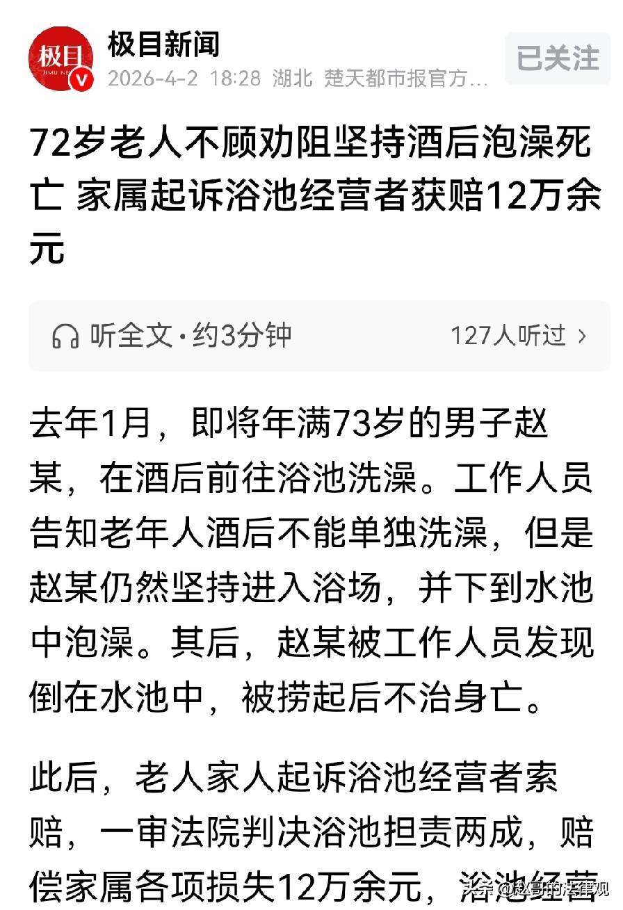 冤不冤?河北秦皇岛,72岁老人,在喝完几两白酒后去浴池泡澡。工作人员闻到他有很浓的酒味,就告诉他,喝了酒一个人不能下浴池,非要泡的话叫家人陪着。老人根本不听,坚持要进浴池,没过多久人就倒在水池里溺亡。家属无法释怀,把浴池方告上法庭,一审法院判浴池方赔12万多。浴池方不服上诉:我们有过提醒是他不听。二审法院经过审理,不但没给浴池“翻盘”,反而在判决书里写了一段让很多人没料到的话。 那天中午,赵大爷喝了点酒,就想去泡个澡,舒服舒服。 他身体一直还算硬朗,平时自己泡澡、洗澡从没出过问题,他去了附近的一家浴池。 可那天他喝了白酒,办完手续正要下水池的时候,工作人员闻到他一身酒气,赶紧拦下他。 并提醒说,您老这情况不能一个人下浴池,出了事我们担不起。 赵大爷立马不乐意了,说自己每天都喝酒,又不是没这么干过,不会出事的。 工作人员看赵大爷不听劝,态度也强硬起来,让他叫家人来陪着,不然出了事我们不管。 赵大爷摆摆手,我花钱买票了不用你管,自顾自的下了水池。 浴池里热气腾腾,池子里的水挺热,赵大爷觉得泡澡就个舒服事。 可谁也没想到,才过了10分钟左右,工作人员过来巡视的时候,发现赵大爷已经歪倒在水池里了。 旁边有人喊了一声,几个人赶紧把他从水里拽上来,放在池沿上抢救。 有人打了120,等急救车到的时候,人已经没了。 家属接受不了,出门的时候有说有笑好好的一个人,泡了个澡人咋就没了? 赵大爷的子女找到浴池,要为父亲讨个公道。 他们认为浴池,作为公共场所,没有做到安全保障的义务。 水池边,如果有专人盯着,父亲也不会发生溺亡,所以,父亲出了事浴池必须赔偿。 浴池老板觉得自己冤,说墙上贴了警示标志,工作人员也口头劝了,该做的我们都做了。 俗话说,阎王都拦不住该死的鬼,他自己非要洗,怎么能怪我们? 家属讨不到便宜,直接将浴池方起诉到法院。 一审,法院经过审理后认为,浴池作为经营场所,必须要尽到安全保障义务。 虽然贴了警示,工作人员也劝了,但光靠这些还不够。 赵大爷进水池之后,浴池没有安排人员及时巡查,发现得晚了。 如果当时有人多盯着点,说不定能早点发现异常,后果可能不一样。 所以,浴池要承担一部分责任。 同时,赵大爷自己是成年人,明知道喝了酒,工作人员也劝了,还坚持要泡澡,主要责任在他自己身上。 最终,法院判浴池需承担20%的责任,赔偿家属12万多,家属自己承担80%的责任。 浴池方老板不服,这事根本不怨我们,老人溺亡可能是他身体自身原因造成的。 浴池方上诉,理由也很实在,他说自己就是个小浴池,开在村里头。 大过年的顾客多,生意忙,怎么可能时时有人盯着。 而且,从赵大爷进池子到被发现,也就十分钟左右,这个频率根本做不到。 再说,小本生意本来就挣不了几个钱,这一下赔10多万,相当于一两年白干。 二审法院并没有支持他的说法。 法官认为,安全保障义务的大小,跟经营规模确实有关系。 但不是说,你规模小就可以不巡查。 赵大爷是72岁的老人,又喝了酒,这是明显的风险点。 浴池工作人员,既然已经意识到了风险,就更应该注意老人的一行一动。 只一句口头劝告就是不负责任。 10分钟对于普通人来说可能正常,但对于一个,被明确告知有风险的老人来说,时间太长了点。 所以,一审判浴池方20%的责任,在合理范围之内。 最终,二审法院驳回了浴池老板的上诉,维持原判。 这个结果引起了人们的讨论。 有人说,大爷自己作死,家人还讹人家浴池,太不讲理。 也有人觉得,浴池收了钱,就该对客人安全负责,老人出了事,赔钱也应该。 其实,法院判20%的比例,主要还是考虑到老人自己不听劝。 而真正让浴池输掉官司的,不是这件事本身,而是发现得太晚了。 《民法典》第1198条规定:宾馆、商场……娱乐场所等经营场所的经营管理者或者群众活动的组织者,未尽到安全保障义务,造成他人损害的,应当承担侵权责任。 也就是说,像浴池这样的经营场所,要保证来消费的客人安全。 如果没尽到这个义务,导致客人受伤或出意外,就要承担责任。 本案中,浴池知道老人喝了酒泡澡有风险,虽然口头提醒了。 但没安排人及时巡查,没及时发现老人溺水,就是没尽到安全保障义务,所以要承担相应的赔偿责任。 所以,在一些经营场所,发生规劝后不听,仍然我行我素的人,不要和他硬杠,必要时要报警处理,可避免不必要的纠纷。 对此,你怎么看? 关注@赵哥的法律观 ,欢迎评论区发表您的看法。