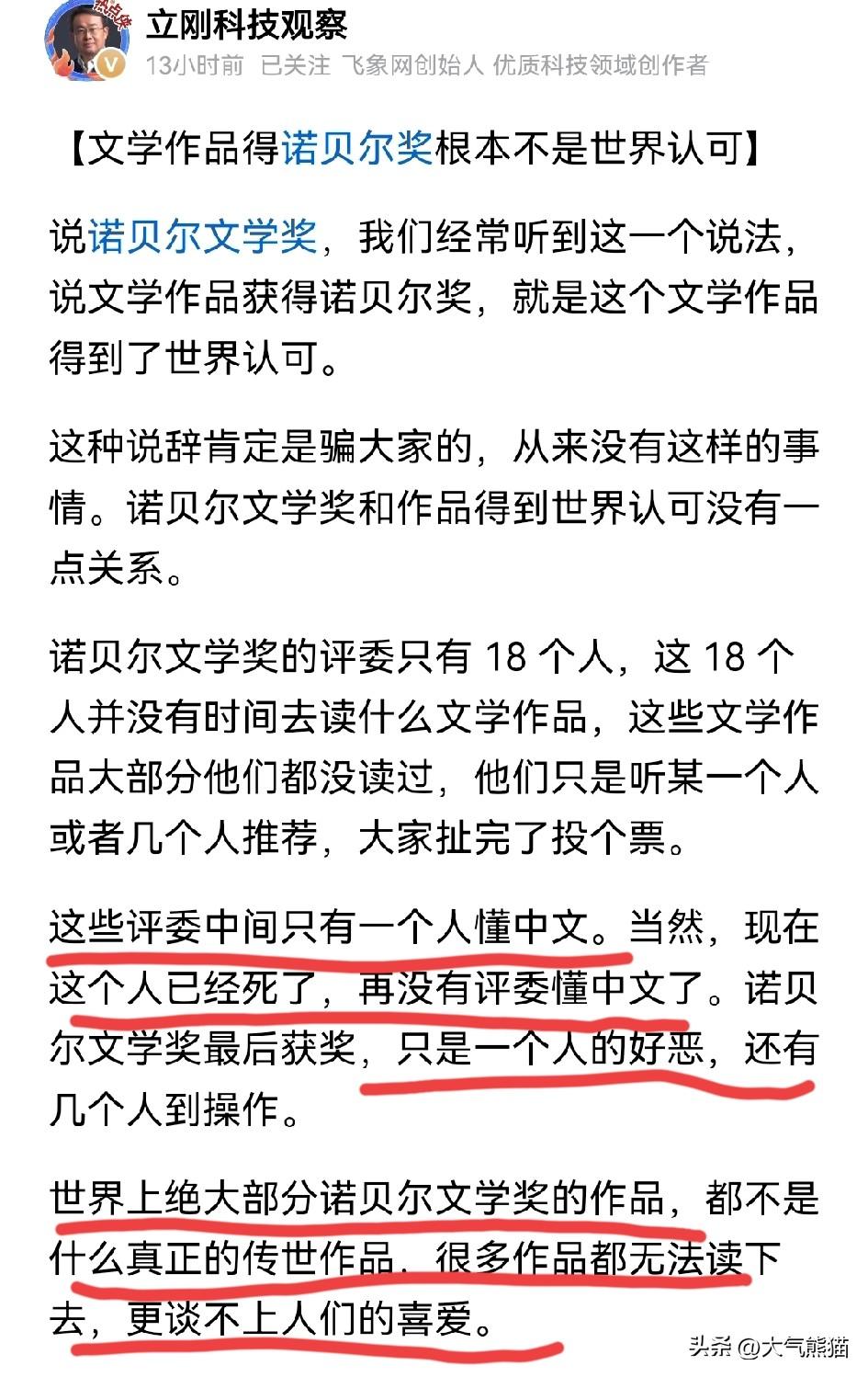 项立刚这一次算是掀了诺贝尔文学奖的桌子! 项立刚这次直接怒怼诺贝尔文学奖,直言它根本代表不了世界认可,获得这个奖项的必须符合西方所谓的人权民主自由价值观的政治正确,否则,连门槛可能都没法进入。 那些心心念念一直把诺贝尔奖项当成世界最高殊荣的人,一定要明白一个事实,这只能算是一个小圈子选奖,18个评委中只有一个人懂中文,那么他们能读懂中国的文化吗?他们能感受到汉语的魅力吗? 何况现在唯一懂中文的人也已经去世,也就是说,现在的评委没有一个人真正的懂中文,那么,中文作品还能有希望吗? 项立刚
