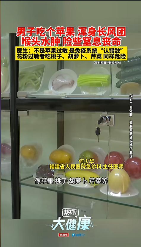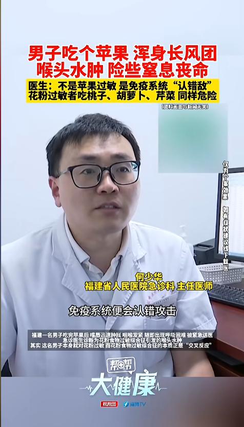 “过敏的人还能吃啥啊!”福建,一男子吃了个苹果后,开始起皮疹,后来出现了呼吸困难,紧急送医后才获救。这么明显的过敏反应,可医生却说,他并不是苹果过敏,而是免疫系统认错“敌人”了。这是怎么一回事呢?网友:和过敏原长得太像? 又到了春暖花开的好时节,可对有些人来说,这美景美色,却是噩梦的开始,原因无他,正是花粉过敏。可谁能想到,对这些人来说,不接触花粉,也有可能花粉过敏。 据媒体4月2日报道,该男子对花粉过敏,平时也都比较注意,可没想到,这天他就吃了个苹果,结果就浑身起疹子,差点窒息丢掉了小命,幸亏送医送的早。可男子就纳了闷了,我也没接触花粉啊! 急救室医生诊断的是花粉食物过敏综合征,这确实不是对苹果过敏,而是免疫系统发生了误判,错误的把它当过敏原了。医生解释,很多花粉中的过敏蛋白,和一些果蔬中的蛋白很像,进入人体后,就容易被认错,引起过敏。 这种症状一般是从口腔开始,先是瘙痒,然后粘膜肿胀,后面有可能发展成休克。苹果、桃子、胡萝卜、芹菜等都是常见的容易引起交叉过敏的果蔬。所以,花粉过敏的人,吃果蔬的时候一定要慎重,发现情况不对要及时的就医! 信息来源:《男子吃个苹果 浑身长风团 喉头水肿 险些窒息丧命 医生:不是苹果过敏 是免疫系统“认错敌” 花粉过敏者吃桃子、胡萝卜、芹菜 同样危险》第一帮帮团