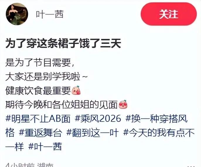 叶一茜说她为了《浪姐》能穿上那条裙子饿了三天。可是怎么肚子还这么大,而且这条裙子也很显老气。看来这三天白饿了。