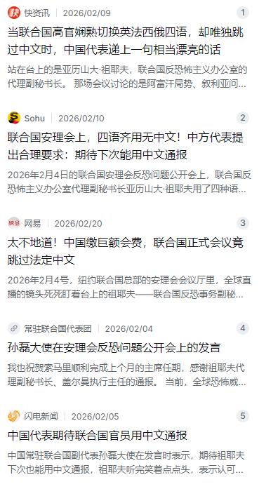 联合国这吃相,属实有点难看了。拿着中国缴的巨额会费,享受着中国的大国担当,转头就在正式会议上,把中国的法定官方语言当空气。一场全球直播的反恐通报会,副秘书长轮番用四种语言发言,唯独跳过中文,全程一字未提。 麻烦看官老爷们右上角点击一下“关注”,既方便您进行讨论和分享,又能给您带来不一样的参与感,感谢您的支持! 事情发生在2026年2月4日,地点是纽约联合国总部的安理会会议厅。那是一场安理会就全球反恐问题召开的公开通报会,规格很高,面向全球直播,15个成员国的常驻代表都在场,几十个国家线上参会,全球主流媒体都盯着。会议讨论的是阿富汗局势、叙利亚问题、非洲萨赫勒地区的安全风险与国际反恐合作,每一个议题都牵动全球神经,分量可想而知。 站在台上做通报的,是联合国反恐怖主义办公室的代理副秘书长,叫亚历山大·祖耶夫。这个人显然做了充分准备,语言能力也确实了得。他先是英语开篇,逻辑清晰,数据详实;接着切换到俄语,谈中亚和东欧方向的防控情况,衔接得很自然;然后是一段法语,表达精准得体;最后还用了西班牙语,聊拉美地区的跨境渗透问题,全程将近四十分钟,四种语言轮着来。 听起来挺厉害,对吧?可问题在于,联合国有六种官方语言,分别是阿拉伯文、中文、英文、法文、俄文和西班牙文。也就是说,祖耶夫用了四种,唯独把中文和阿拉伯语给跳了过去。全场没有一个中文字儿蹦出来,连中文同传频道都没开通,直接给静音了。 很多人可能会想,是不是中文同声传译没准备好?或者出了什么技术故障?但事实并非如此。按照联合国的规定,凡是正式会议,秘书处都要负责现场提供六种语言的同声传译,重要发言要用六种文字印发。《联合国宪章》白纸黑字写得明明白白,六种官方语言具有同等法律效力。这不是什么可以商量的事,这是联合国自身制定的规则。技术问题?如果真的出了技术问题,为什么英语、俄语、法语、西班牙语四条频道都好端端地开着,唯独中文和阿拉伯语同时出了问题?这种巧合,实在让人难以信服。 更让人不是滋味的是,中国在联合国体系里的分量,真的一点都不轻。根据联合国的会费分摊方案,中国承担的比例已经达到20.004%,仅次于美国的22%,是名副其实的全球第二大会费国。按照2026年的常规预算规模,中国实际缴纳的会费净额高达6.3542亿美元。除了常规会费,维和预算中国也是第二大出资国,累计派出的维和官兵和警务人员超过五万人次,足迹遍布全球二十多个国家和地区。在反恐领域,中国给联合国反恐办公室、全球反恐中心捐了不少专项资金,面向一百多个国家和地区办了上百期反恐培训班,培养了上万名专业人才。这些不是喊口号,是真金白银、实实在在的付出。 一边是巨额会费、大国担当,另一边是联合国高官在全球直播的会议上把中文当空气。这种落差,换谁心里都不舒服。 但中国代表的反应,确实让人服气。发言的人是中国常驻联合国副代表孙磊大使。孙磊先是在发言中阐明了中方对全球反恐形势的核心立场。他说,当前全球恐怖威胁日趋复杂,重大恐袭事件时有发生,恐怖组织技术手段不断升级。他特别点名了“伊斯兰国”“基地”组织、“东伊运”等恐怖组织,指出它们在阿富汗依然活跃,持续威胁周边国家安全,同时呼吁国际社会坚持对恐怖主义零容忍,坚决反对选择性反恐和双重标准,加强团结合作。 把中方立场说完之后,孙磊才不紧不慢地补了一句:“期待祖耶夫下次也能用中文通报。”就这么一句话,没有拍桌子,没有措辞强硬的抗议,连语气都是平和从容的。 有意思的是,祖耶夫听完这话之后,当场笑着点了点头,表示认可。一个点头,一个微笑,就坐实了整件事的性质——他确实跳过了中文,他自己也知道。而孙磊那句“期待”,就像一面镜子,把对方的不周全照得清清楚楚,自己却保持着体面和大度。很多人评价说,这算得上一次教科书级别的外交回应,温和,但绝对不软弱。 不过话说回来,这件事背后的深层问题,远不止一个人忘了用某种语言发言那么简单。联合国的六种官方语言,在实际运作中长期处于一种“纸面上平等、现实中分层”的状态。英语毫无疑问是绝对的“国际普通话”,法语、俄语、西班牙语因为历史和地缘政治的原因,在国际场合的使用频率也远高于中文。有数据显示,联合国日常工作中中文文件的比例连1%都不到。大量重要信息先以英文或者其他语言发布,中文版得靠翻译,要么延迟,要么在转译中损耗信息。 这不只是面子问题,这是话语权问题。语言是权力的载体。一种语言在国际最高平台上长期缺少原声表达,使用这种语言的国家所代表的立场、视角和利益关切,就会在转译中被削弱、被延迟、甚至被曲解。联合国的多语言制度,本质上是多边主义的基石。如果连语言平等都做不到,成员国的参与感从何而来?