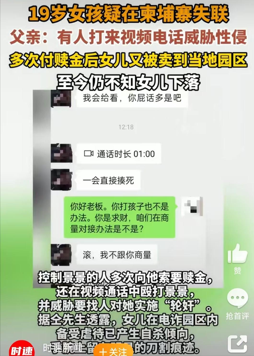 🌙比套头塞车更恐怖的绑架,你根本想不到 2026年1月31日,河南南阳19岁的独生女景景,跟家人谎称要独自回老家,就此与家人完成了最后一次正常告别。 景景是家里的独生女,从小在父母的呵护下长大,性格单纯心软,平时也没怎么独自出过远门,家人一直把她当成掌上明珠。没人会想到,1月31日那天,景景随口说的一句“我回老家走亲戚,自己一个人就行”,会成为这个家庭噩梦的开端。 那天早上,景景收拾了一个小小的行李箱,里面就装了几件换洗衣物,语气和平时没什么两样,还跟妈妈叮嘱了一句“不用惦记我,我到了给你们报平安”。 家人压根没多想,毕竟老家离市区不算太远,以前景景也跟着家人一起回去过,而且她已经19岁,家人觉得让她独自回去一次,也能锻炼一下独立能力。 景景出门后,家人像往常一样忙碌着自己的事,妈妈还特意提前给老家的亲戚打了电话,说景景已经出发了,让亲戚到时候留意一下,可亲戚那边却一头雾水,说根本不知道景景要回去。 起初家人还以为是亲戚记错了,或者景景路上耽搁了没及时联系,直到中午吃饭的时候,妈妈给景景打电话,电话却提示无法接通,微信也发了消息,始终没有回复。 家人这才开始慌了神,爸爸放下手里的活,立刻开车往老家赶,一路上不停的给景景打电话、发微信,可始终没有任何回应,老家的亲戚也发动身边的人,在村子里、附近的路口四处寻找,连景景的影子都没见到。 他们跑遍了景景平时可能去的地方,联系了她的同学、朋友,所有人都表示没见过景景,也不知道她的去向,一种不祥的预感,瞬间笼罩了整个家庭。 无奈之下,家人只能选择报警,警方接到报警后,立刻启动了失踪人员排查机制,调取了景景出门后的监控,这一查,才发现了不对劲的地方。 监控显示,景景出门后并没有往老家的方向走,而是打车去了南阳车站,之后又乘坐高铁去了郑州,紧接着转乘航班飞往了广西南宁,这一连串的行程,她全程瞒着所有家人,没有透露半句。 更让人揪心的是,景景在南宁机场的监控画面里,显得十分犹豫,一个人在大厅里徘徊了将近一个小时,时不时的四处张望,像是在等什么人,又像是在纠结要不要继续往前走。 就在家人以为能通过监控找到更多线索的时候,监控画面突然断了,景景最后出现的画面,是坐上了一辆黄色出租车,车子朝着边境方向驶去,之后她的手机信号,就在广西东兴彻底消失了。 接下来的日子,家人像是活在地狱里一样,每天不吃不喝,四处打听景景的消息,警方也一直在全力侦查,联动多警种展开轨迹追踪,不放过任何一丝线索。 就在家人快要绝望的时候,景景的微信突然有了动静,可发来消息的并不是景景本人,而是一个陌生账号,对方一开口就索要高额赎金,语气嚣张又恶劣。 对方还特意发起了视频通话,家人接通后,看到的画面让他们心如刀绞,景景被关在一个狭小漆黑的房间里,脸上有明显的伤痕,眼神麻木,看到家人后,只能无助的流泪,却一句话也说不出来。 歹徒在视频里不停的威胁,说如果不按时打够赎金,就对景景下手,还说他们的势力很大,就算家人报警,也找不到他们,更救不回景景。 景景的爸爸只是一个普通的老百姓,家里没有多少积蓄,可看着女儿受苦,他没有丝毫犹豫,卖掉了家里唯一的汽车,又挨家挨户找亲戚朋友借钱,好不容易才凑够了11万赎金,按时打到了歹徒指定的账户。 家人满心以为,交了赎金,景景就能平安回来,可没想到,歹徒收到钱后,不仅没有放人,反而变得更加肆无忌惮,还发来嘲讽的语音,说“有本事就来找到我们”,彻底击碎了家人的希望。 后来通过警方的深入侦查,家人才知道,景景是被人诱骗了,对方伪装成网友,用高薪兼职的名义引诱她,一步步让她陷入圈套,最后把她偷渡到了柬埔寨的电诈园区,进行非法拘禁。 警方很快正式立案侦查,联动相关部门展开跨境救援,可电诈园区高墙林立,有武装人员看守,救援难度极大,景景的安危,成了家人最大的牵挂。 其实景景的遭遇,并不是个例,现在很多骗子都会伪装成好心人、网友,用各种诱惑手段,专挑景景这样单纯、警惕性低的青少年下手,他们的套路隐蔽又恶毒,让人防不胜防。 家人现在每天都在祈祷,希望景景能平安获救,也后悔当初没有多留意景景的异常,没有多提醒她注意安全,可世上没有后悔药,只能默默等待警方的消息。 很多人看完景景的经历,都忍不住揪心,也开始反思,平时该如何提醒家里的孩子防范这类骗局。 不知道大家怎么看这件事?
