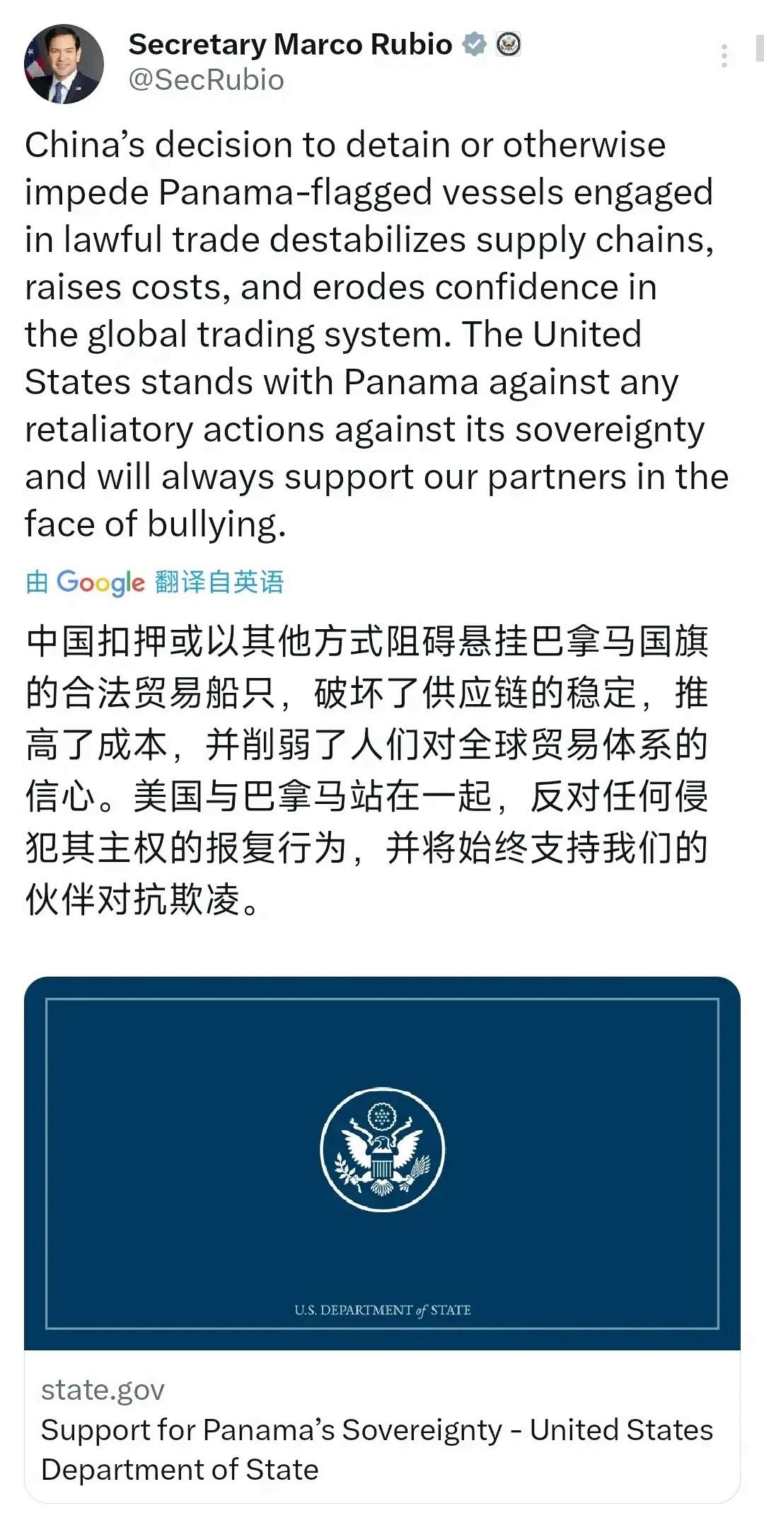 美式双标,从来只有更双标,没有最双标! 鲁比奥深夜跳出来指责中国,说我们“扣押巴拿马商船、破坏全球供应链”,还装模作样地替巴拿马撑腰,说要“反对欺凌”。 可真相呢?中国只是按国际规则做正常的船舶安全检查,手续不全、安全有问题,查一查天经地义,根本不存在什么“扣押”。 反观美国,才是全球海域的“拦路强盗”。动不动就拦截别国商船、扣押货物,用制裁搞乱贸易,把全球供应链搅得鸡犬不宁。自己一身黑,还好意思指责别人? 更讽刺的是,巴拿马自己撕毁港口合作协议,背信弃义,美国在背后煽风点火,现在倒打一耙,把锅甩给中国。 鲁比奥这一套,说白了就是借题发挥、抹黑中国,根本不是为了什么公平正义。 这种颠倒黑白的表演,国际社会看得清清楚楚,只会越来越反感美国的霸权嘴脸。 你觉得美国这种双标操作,还能骗多久?评论区聊聊!