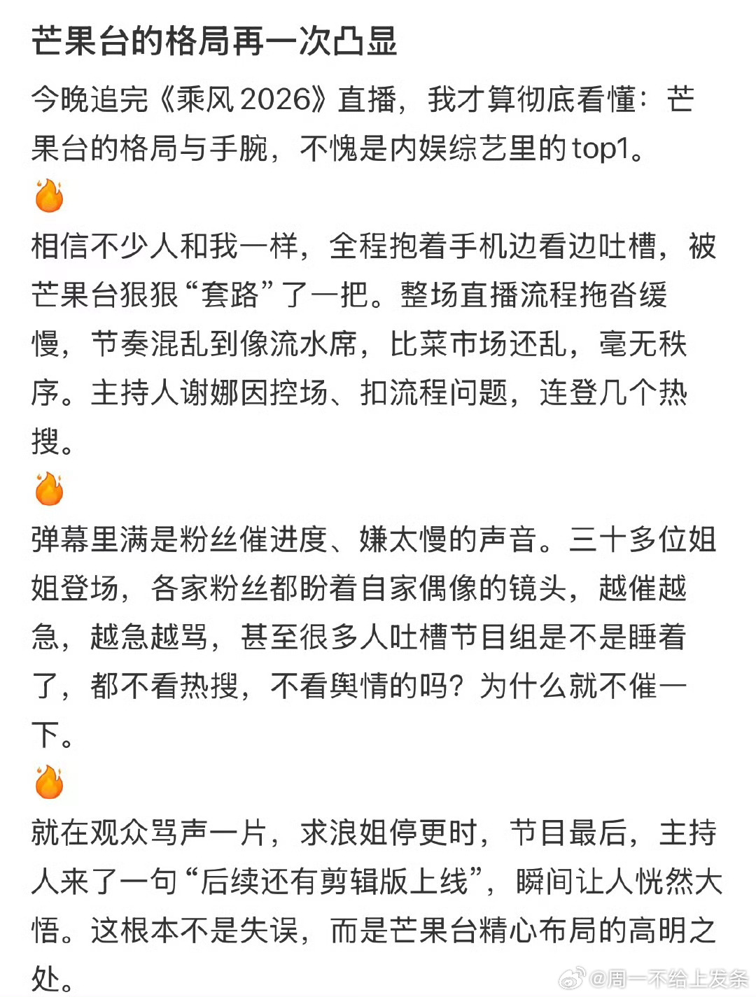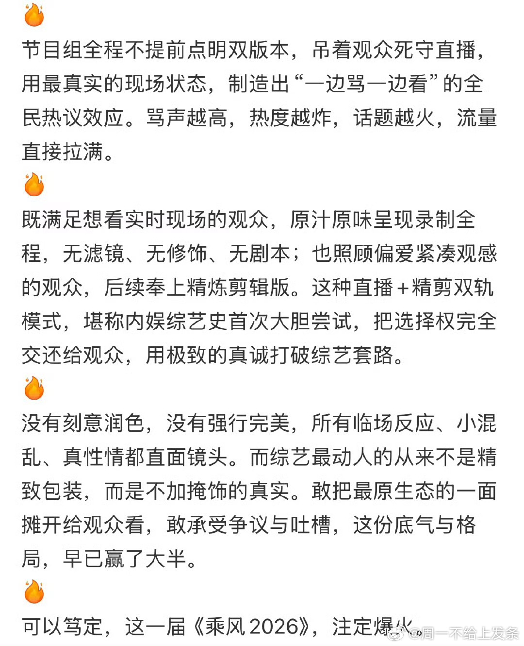 芒果的格局再一次凸显浪姐直播虽时长稍长流程偏慢,直到凌晨才落幕,谢娜暖心回应后续会有更流畅剪辑版,瞬间安心,期待正片精彩呈现~乘风2026
