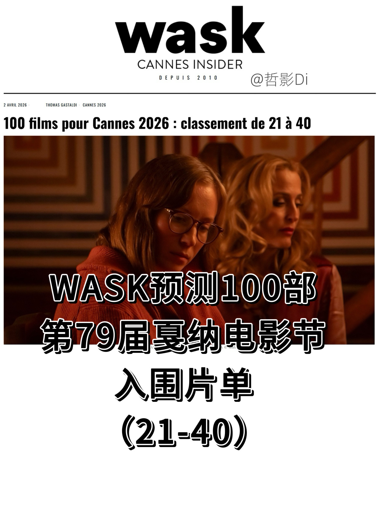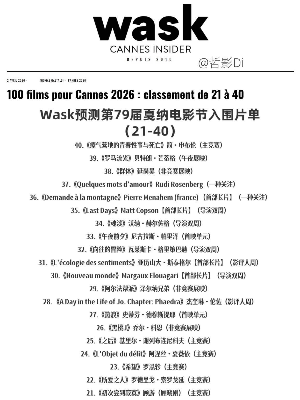 Wask预测100部第79届戛纳电影节入围片单(21-40)发布,顾游执导,周迅、奚美娟、王圣迪、周一围、穆祉丞主演的华语新片《初次尝到寂寞》预测将入围本届主竞赛单元。此外,主竞赛单元预测还提及了罗泓轸的《希望》、罗德里戈·索罗戈延的新片《所爱之人》等。预测片单如下↓ ↓ ↓