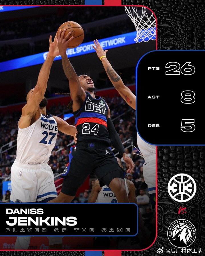 活塞113-108战胜森林狼,森林狼输球后位于西部第六,活塞方面,詹金斯26分5板8助、杜伦22分14板4助2帽、罗宾逊15分4板3助;森林狼方面,兰德尔27分6板6助、里德19分6板3助2帽、道苏姆19分5板4助2断。