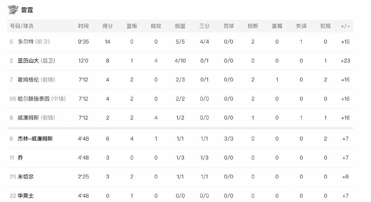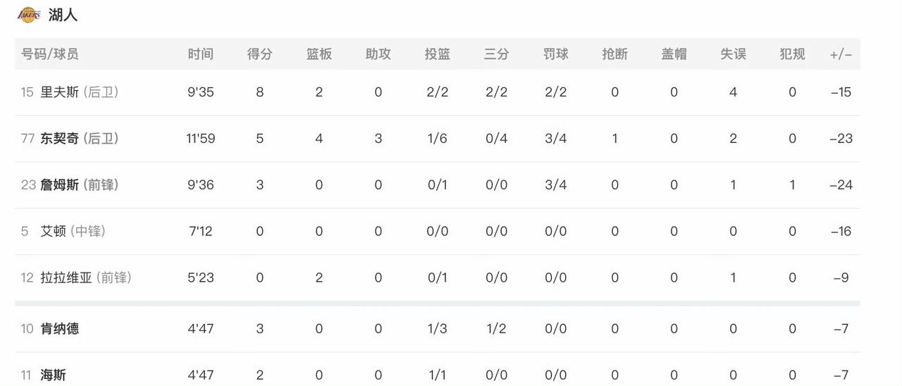 是雷霆防守太好,还是客场压力大?第一节结束,湖人21-44落后雷霆23分,一节就被打花了。 詹姆斯首节无运动战进球,4罚3中得到3分,正负值全队最低-23。 洛杉矶湖熊的防守尿性又来了,雷霆下手没轻没重的,估计我湖早就放弃了。