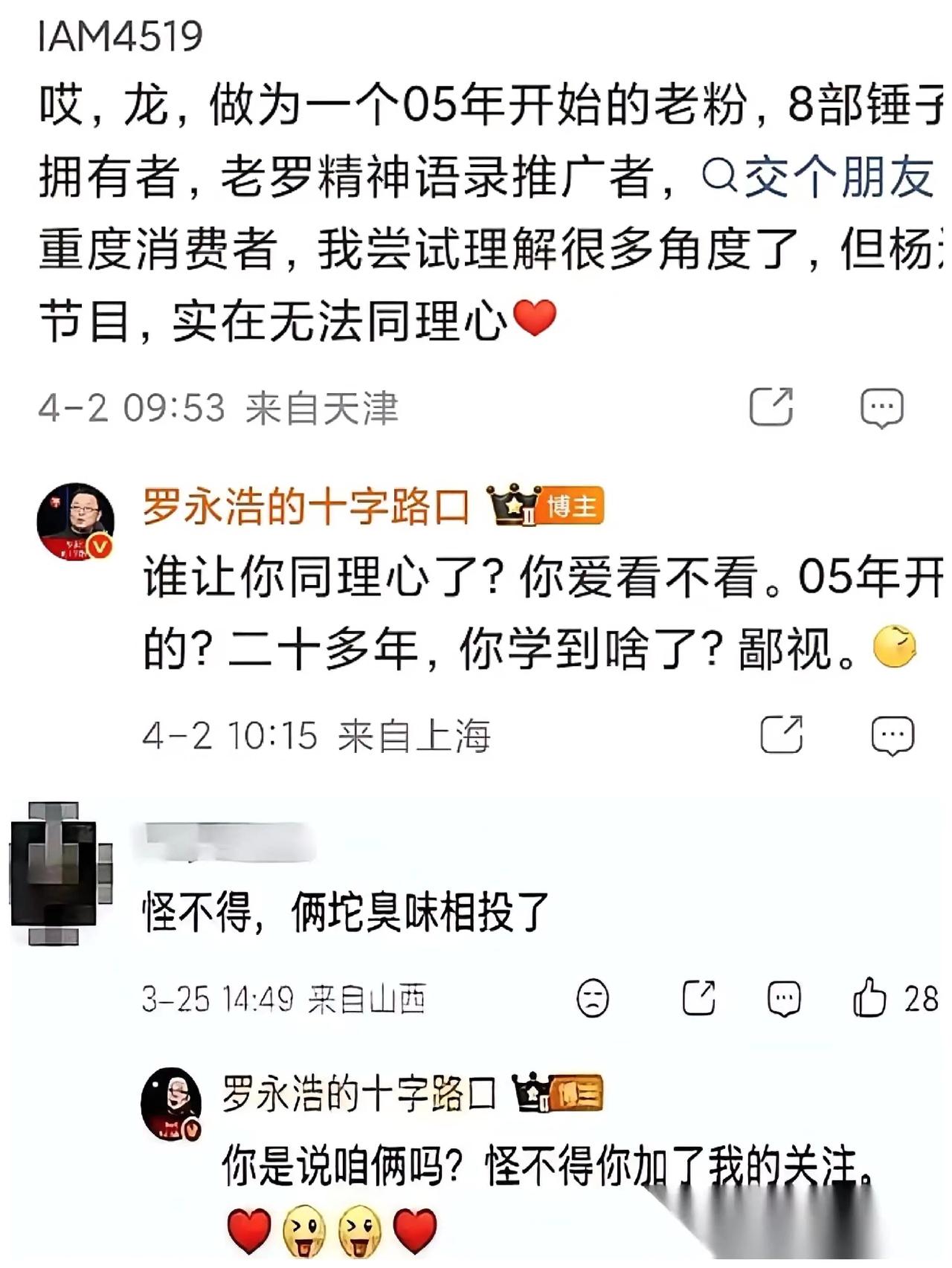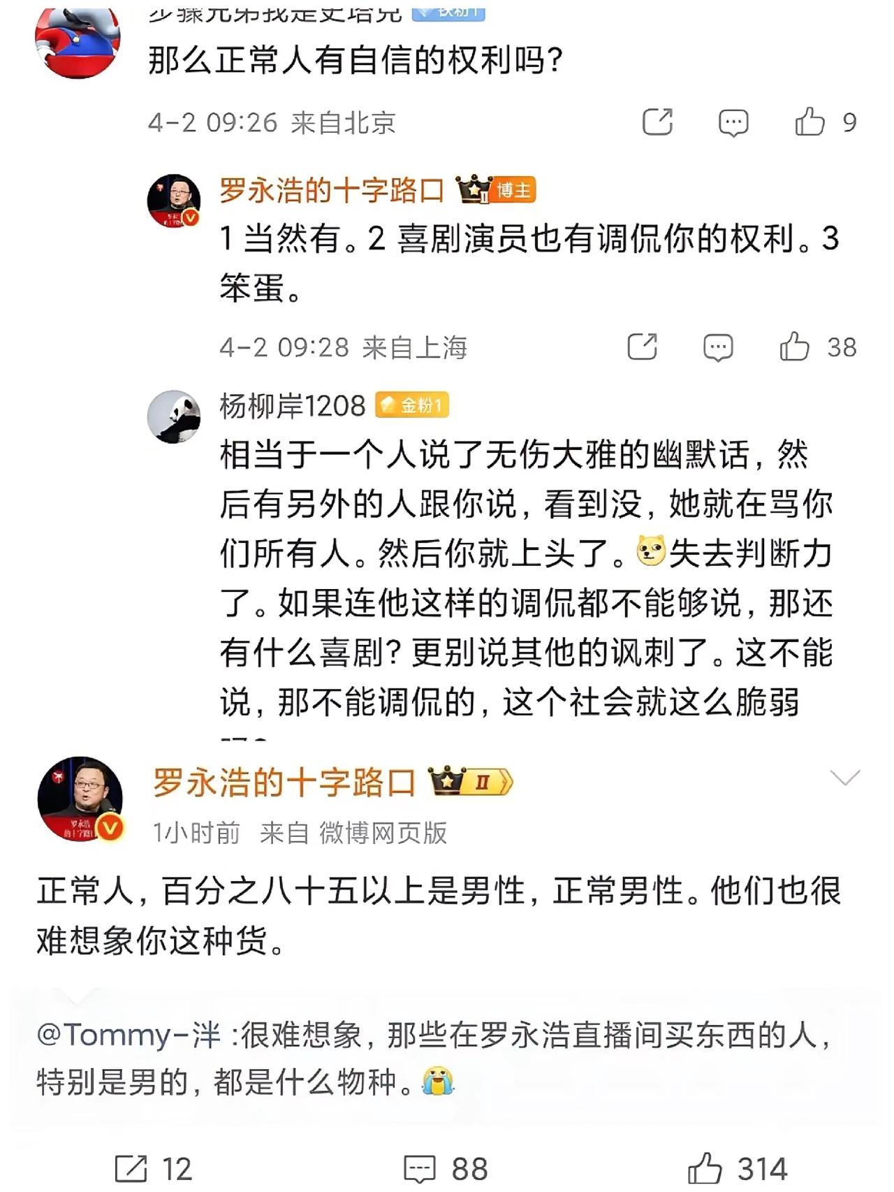 破案了!罗永浩这次火力全开“端起碗吃肉,放下筷子骂娘”。 很可能就是为了把“跟随他多年、但已经没有价值”的粉丝清理掉,这是想重新找一群人“奶他”。 “普信男”和“普信女”都是他这次抛弃的对象。为此专门查了一下豆包“什么是普信男普信女”? 原来是出于2020年杨笠在《脱口秀大会》的段子:“为什么他看起来那么普通,却可以那么自信?” 有一点没搞懂。 我们承认“我们大部分都是普通人”,但谁在定义“普通”? 还有一点没搞懂。 老罗怎么认为自己就不是“普通人”? 谁给他的勇气? 梁静茹还是梁咏琪吗? 还有一点没搞懂。 没有这些普通人,他吃啥?喝啥? 这个社会本来就是由绝大多数普通人构成的。 再说,没有这些普通人。 他拿什么去还债? 端起碗吃肉,放下筷子骂娘。 最后,普通人就怎么不能自信了。 自信除了来自于个人。 还来自于我们的国家成就。 也来自于我们最朴素的对错思辨能力。 罗永浩