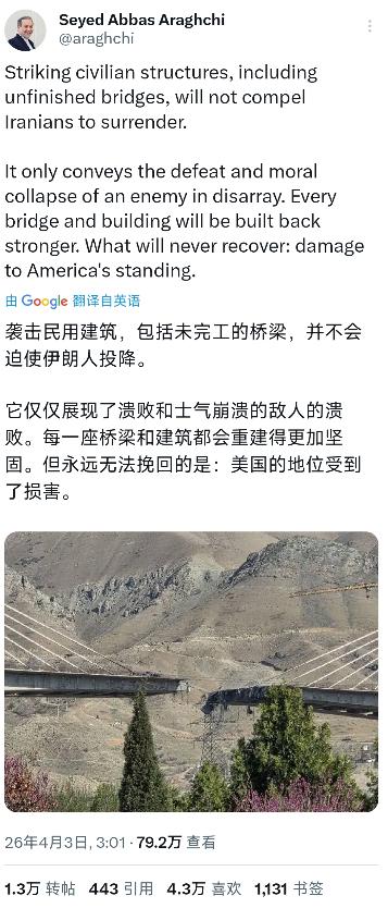 伊朗外长阿拉格齐今天(北京时间4月3日)写道:“袭击民用建筑,包括未完工的桥梁,并不会迫使伊朗人投降。它仅仅展现了溃败和士气崩溃的敌人的溃败。每一座桥梁和建筑都会重建得更加坚固。但永远无法挽回的是:美国的地位受到了损害。” 伊朗外长阿拉格齐北京时间4月3日的这番表态,像一枚重磅炸弹炸响在持续焦灼的中东战场上。此时,美国、以色列与伊朗的军事冲突已经进入第34天,战火从最初的军事设施打击,早已蔓延到了伊朗的民生根基。 大家可能没注意到,阿拉格齐口中的“未完工桥梁”,正是4月2日遭美以空袭的卡拉季市贝伊克公路桥——这座连接德黑兰与卡拉季的交通核心工程,在轰炸中受损封闭,还造成8名平民死亡、95人受伤。 而这只是美以近期攻击民用目标的一个缩影,从4月1日开始,伊斯法罕、胡齐斯坦的钢铁厂(军工核心材料供应商)接连被炸,德黑兰、哈马丹等多地的民用设施陷入一片火海。 更让人揪心的是,民用设施遇袭早不是个例。伊朗红新月会的数据显示,截至4月1日,已有超过11.5万处民用设施受损,330多家医疗卫生机构遭破坏,24名医务人员在救治中遇害。 教育系统更是惨遭重创,600多所学校和教育中心被蓄意袭击,237名学生、56名教育工作者不幸丧生,其中就包括2月28日被美国“战斧”导弹误炸的米纳卜小学,168名花季女童的生命永远停留在了那一天。 面对这些惨剧,美国总统特朗普4月1日晚还在宣称取得“快速、决定性、压倒性胜利”,甚至放话要在未来2-3周发动更猛烈打击,给伊朗设定4月6日的最后通牒,要求开放霍尔木兹海峡、接受核查,否则就把伊朗“炸回石器时代”。但这种强硬表态,更像一种色厉内荏的掩饰。 因为现实是,伊朗的反击远比美国预想的猛烈。就在美以轰炸桥梁的同一天,伊朗革命卫队展开“真实承诺-4”行动,10分钟内5波齐射,100多枚弹道导弹、数十架无人机和200多枚火箭弹覆盖以色列全境,特拉维夫、海法的空军基地和军工设施被精准命中。 更狠的是,伊朗还联动黎巴嫩真主党、也门胡塞武装形成三线夹击,打击了迪拜甲骨文数据中心、巴林亚马逊设施等美以海外资产,4月2日晚甚至在波斯湾击落一架先进战机。 国际社会的态度更是给了美国一记耳光。联合国人权事务高级专员强烈谴责袭击平民的行为,敦促美国彻查小学遇袭事件并伸张正义。 中国代表在联合国直言,这种暴行突破了人类道德良知底线,是对国际人道法的公然蔑视。俄罗斯更是直接定性美以行动为“危险冒险”。就连美国的北约盟友也集体“跑路”,英、法、德、日均明确拒绝参战或支援,跨大西洋联盟的裂痕彻底暴露。 美国国内的反战浪潮也让特朗普焦头烂额。民调显示,66%的美国人反对这场战争,43%强烈反对,纽约、加州等地的反战游行此起彼伏。一边是战场上无法彻底压制伊朗,一边是国内民众的强烈抗议,一边是盟友的纷纷倒戈,特朗普所谓的“压倒性胜利”更像一个自欺欺人的谎言。 这场冲突带来的连锁反应已经席卷全球。布伦特原油价格突破105美元/桶,能源市场的剧烈震荡让各国通胀压力陡增,从欧洲的家庭账单到中国车主的加油费,全世界都在为这场战争买单。霍尔木兹海峡作为全球20%石油运输的“生命线”,被伊朗牢牢掌控,更是让全球能源安全岌岌可危。 现在距离4月6日的所谓“最后通牒”越来越近,美以是否会真的全面轰炸伊朗的电厂、油井等民生设施,还是个未知数。但可以肯定的是,阿拉格齐的话绝非空谈——伊朗已经全民备战,革命卫队放话“地面入侵将绝不留活口”,最高领袖更是重申要封锁霍尔木兹海峡。 美国本想通过武力迫使伊朗屈服,却没想到陷入了进退两难的境地。袭击民用设施非但没能打垮伊朗人的意志,反而让整个国家更加团结,更让美国在国际上彻底失去了人心。正如阿拉格齐所说,被炸的桥梁可以重建得更坚固,但美国的国际信誉和霸权地位,一旦受损,可能再也无法挽回。 这场中东乱局的后续走向,4月6日将是关键节点。但无论结果如何,有一点已经清晰:靠强权霸凌和武力威胁解决不了问题,只会让局势更加失控。和平谈判才是唯一出路,否则,这场战火带来的苦难,还会继续蔓延。