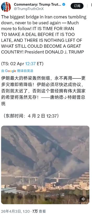 特朗普今天(北京时间4月3日)发文写道:“伊朗最大的桥梁轰然倒塌,永不再用——更多灾难即将降临!伊朗必须尽快达成协议,否则就太迟了,否则这个曾经拥有伟大国家的希望将荡然无存!” 北京时间4月3日,特朗普在“真实社交”平台上的这条发文,配上大桥爆炸的震撼视频,瞬间引爆了国际舆论。视频里,浓烟裹挟着碎片冲天而起,这座被伊朗人引以为傲的工程杰作,在巡航导弹的打击下轰然坍塌,而这背后,是一场精心策划的跨境空袭。 根据央视新闻和新华社的权威报道,被炸毁的是位于伊朗卡拉季市的贝伊克公路桥(又称B1桥),这座桥可不是普通的交通设施。它高达136米,是中东地区最高的桥梁,也是全球结构最复杂的高架桥之一,从2015年开始建设,原本再过不久就要正式通车,连接德黑兰与里海地区,是当地重要的交通大动脉。 让人愤怒的是,这完全是一次针对民用设施的袭击。伊朗阿尔博兹省副省长证实,空袭发生时,桥上没有任何军事活动,附近村庄的民众正在户外野餐,庆祝波斯新年诺鲁孜节的最后一天。更恶劣的是,美军和以色列发动了双重空袭,第一次击中桥梁后,在急救人员赶到现场救援时,又发动了第二次轰炸,直接导致8名平民死亡、95人受伤,无辜生命在炮火中消逝。 特朗普在视频里得意洋洋地宣称“桥梁永不再用”,但他没说的是,美军为了摧毁这座尚未通车的大桥,动用了至少8枚巡航导弹,总价值上千万美元。有军事专家分析,这些导弹要么是核潜艇发射的战斧巡航导弹,要么是战斗机搭载的JASSM导弹,如此大动干戈,显然不只是为了一座桥那么简单。 这背后,是美伊之间悬而未决的谈判博弈。当前,美伊正在阿曼的调解下进行伊核问题间接会谈,双方都有达成协议的诉求,但分歧依然尖锐。对特朗普来说,2015年的伊核协议即将在10月到期,如果不能达成新协议,美国将失去限制伊朗核计划的法理基础,而他正需要“搞定伊朗”的政绩来为竞选加分。 对伊朗而言,情况则更为复杂。多年的制裁让伊朗经济濒临崩溃,里亚尔汇率一泻千里,现在93万里亚尔才能兑换1美元,国内民生压力巨大。改革派政府急需通过谈判解除制裁,来回应国内保守派的质疑,但同时又不能在国家尊严上让步。特朗普选择在这个时候动武施压,就是想逼迫伊朗在谈判桌上妥协。 面对这种赤裸裸的威胁,伊朗方面没有示弱。外长阿拉格齐当天就强硬回应,称“破坏民用设施绝不会让伊朗投降”,被毁的桥梁会重建得更加坚固,而美国的国际地位将不可逆转地受损。更让人关注的是,伊朗革命卫队已经划定了报复目标,法尔斯通讯社公布了一份包含约旦、科威特、沙特、阿联酋四国的8座桥梁清单,这些都是所在国的关键生命线,没有备用替代方案。 这意味着,中东局势可能会陷入“以桥换桥”的报复循环。以色列虽然嘴上说“不负责任”,但明眼人都知道,这次空袭是美以联军的共同行动。国际危机组织的法律专家直言,打击民用桥梁根本不是为了军事优势,而是纯粹的政治胁迫,严重违反了国际法。 现在的问题是,特朗普的“极限施压”能达到目的吗?从目前的情况看,可能性不大。伊朗在中东地区依然拥有强大的反击能力,之前就曾用导弹和无人机袭击过以色列目标,而美国虽然部署了航母战斗群和B2轰炸机,但也不敢轻易陷入全面战争。 更关键的是,双方的谈判分歧短期内难以弥合。美国要求伊朗销毁部分核设施,伊朗则坚决拒绝,只同意在国际监督下封存;美国难以真正取消制裁,伊朗又把解除制裁作为谈判的底线。这种死结,显然不是炸一座桥就能解开的。 特朗普口中的“更多灾难”,或许是指进一步的军事打击,但这很可能引发连锁反应。一旦伊朗对中东四国的桥梁动手,全球石油运输通道将受到严重影响,国际油价可能暴涨,这对本就脆弱的全球经济来说,无疑是一场灾难。 目前,国际社会都在呼吁双方保持克制,联合国安理会也可能就此召开紧急会议。但特朗普的强硬表态,已经把局势推向了危险边缘。这座倒塌的桥梁,不仅是伊朗的工程损失,更是中东和平的又一道裂痕。 接下来的几周,美伊谈判将进入关键阶段,而伊朗的报复行动是否会如期而至,成为最大的悬念。特朗普想要用炸弹逼迫伊朗屈服,但历史已经多次证明,霸权主义的高压政策,从来都无法赢得真正的和平。这场围绕桥梁和协议的博弈,最终会走向何方,我们将持续关注。