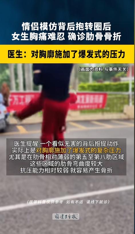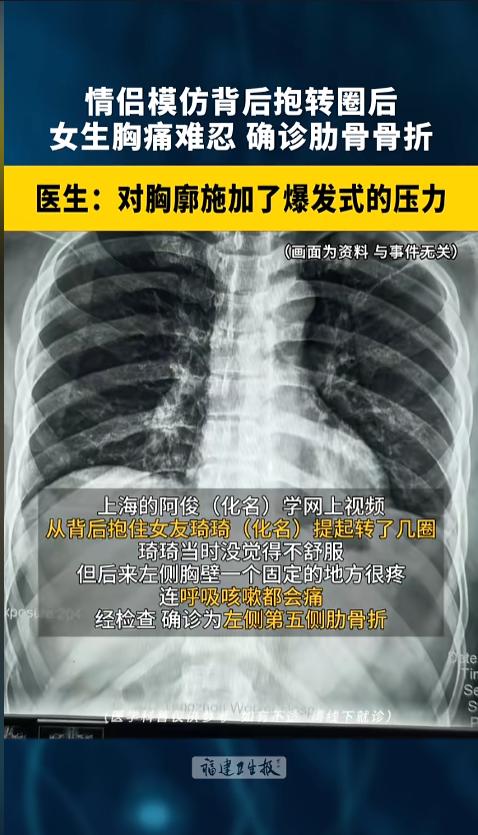 “以为是爱结果成了伤害!”上海,一对儿情侣模仿视频,从背后抱起转圈,女孩当时没觉得有什么,但慢慢的觉得胸不舒服,左侧有个地方很疼,甚至咳嗽呼吸都会疼。到医院一检查,她的肋骨竟然骨折了!网友:不要随便跟风! 据媒体4月2日报道,这对儿情侣在网上刷到一个视频,男孩从后面抱着女孩转圈,他们觉得视频拍的很好看,也自己跟着拍了个同款。没想到,就这一个视频,却让女孩受了伤。 刚开始的时候,女孩也没觉得不舒服,但后来她慢慢发现,自己左胸疼的厉害,还是在一个固定位置上,后来连咳嗽都疼。她这才去了医院检查。 检查结果显示,她左侧的第五侧肋发生了骨折,而骨折的原因,就是拍视频的时候,男友从后面的那一抱。 医生解释,这个看似无害的动作,其实对胸腔施加了一个爆发式的压力。尤其是第五至第八肋区,这地方本来就脆弱,弯曲度还大,非常容易产生骨折。这种危险的动作,轻易不要模仿。 网友看后表示,受教了!本来以为这个动作,最危险的地方是男朋友没抱住,给女孩扔了出去,没想到抱住了也这么危险。果然,网上的视频还是得仔细甄别,不能盲目的跟风啊! 信息来源:《上海