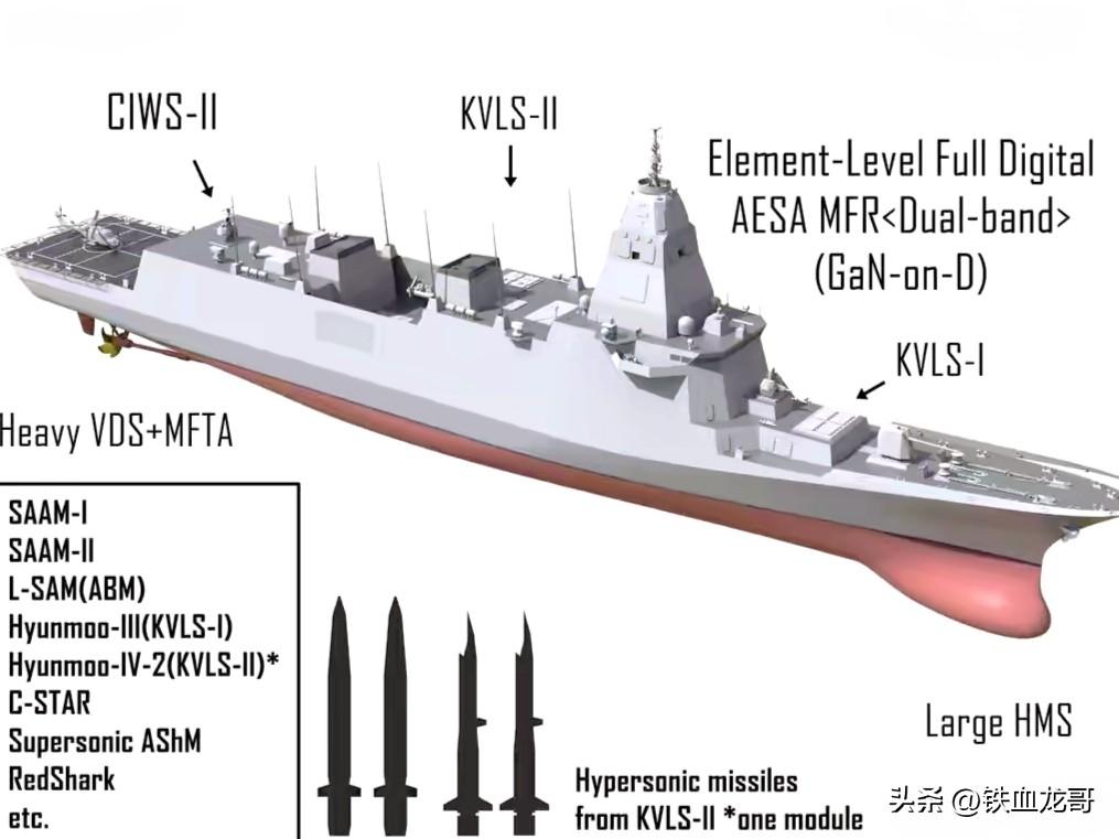 该项目的定位是替代KDX-I/Ⅱ,完全国产化、双波段相控阵雷达、综合电力推进主力战舰。该舰长155米,宽18.8米,吃水9.5米。标准排水量7100吨,满载排水量8000-9000吨。舰员120-140人。武器装备为1门MK45 127毫米舰炮,2座近防系统;64单元垂发,其中前部为32单元KVLS-I(700毫米),可发射K-SAAM(海弓)近程防空导弹(一坑4弹)及红鲨反潜导弹。中部32单元KVLS-Ⅱ(900毫米×9.1米),KVLS-Ⅱ是目前世界上最大的垂发装置。可发射远程防空导弹、玄武3C巡航导弹,以及未来的高超音速导弹和弹道导弹。2座四联装SSM-700K(海星)反舰导弹发射装置。反潜武器为2座三联装反潜鱼雷发射装置,舰尾有机库,可容纳1-2架中型反潜直升机。采用一体化综合射频桅杆,集成韩华公司S+X双波段AESA雷达、电子战、通信、导航等设备。电子战系统为国产EW Suite-Ⅱ。动力系统,为综合电力推进,安装有25兆瓦超大型电机,最大速度为30节。