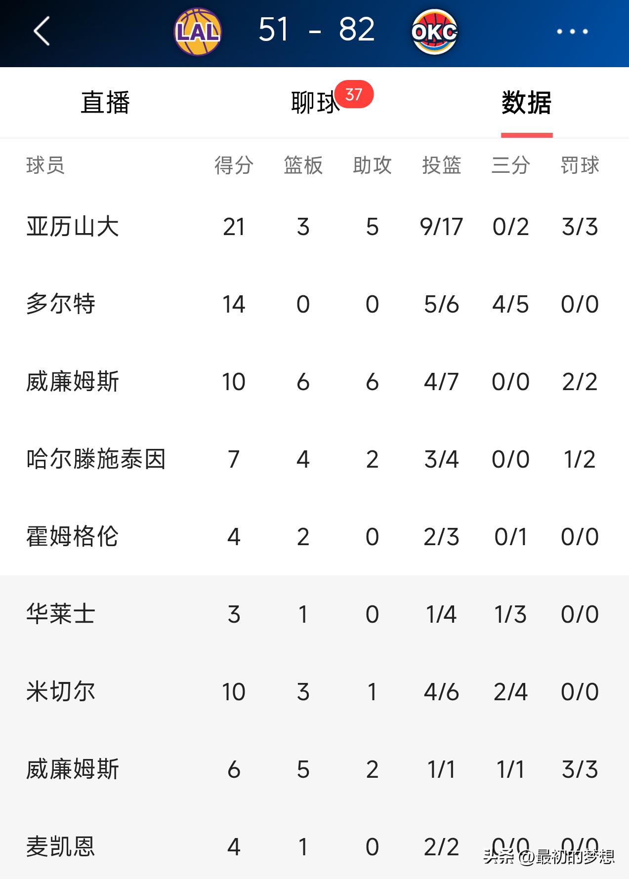 我没看错吧?半场过后雷霆竟然拿到82分? 才打了半场雷霆82:51湖人!差距这么大吗? 亚历山大21分 多尔特14分 威廉姆斯10分 湖人这边仅有里夫斯14分是亮点 更离谱的是湖人半场首发罚球16次,雷霆仅有7次 西部第三和第一差距这么大?艾顿半场0篮板?没有防守的湖人真差劲,后半场再不追分,东契奇的得分王就要打折扣了!