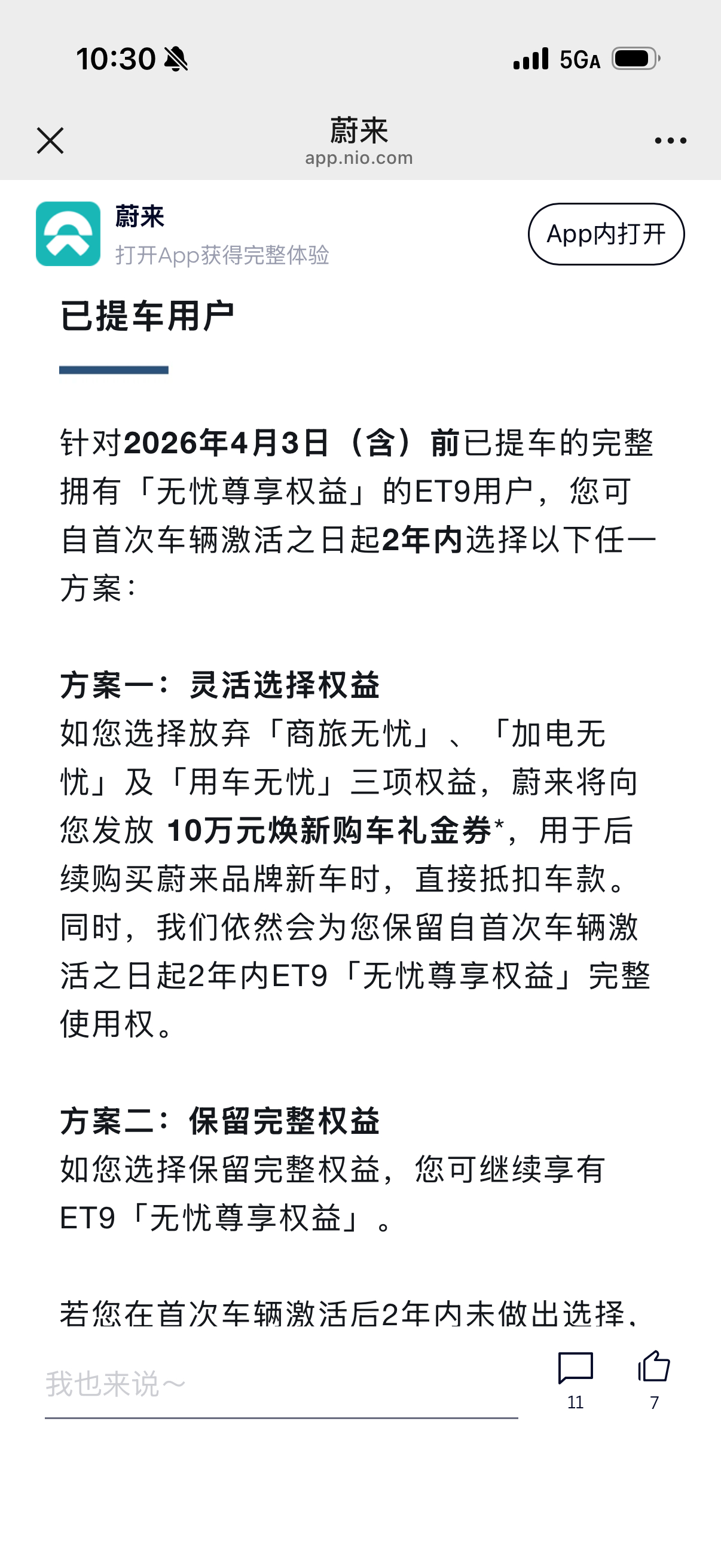 卧槽太牛逼了真的。。。ET9 车主可以选择剥离权益,下一辆车直接减 10 万。。。最主要的是如果你的 ET9 卖了的话,还能给你 10 万的券。。。这10万相当于回收权益变相降价,然后还跑不掉,还只能在蔚来消费。。。这一刀,牛逼啊