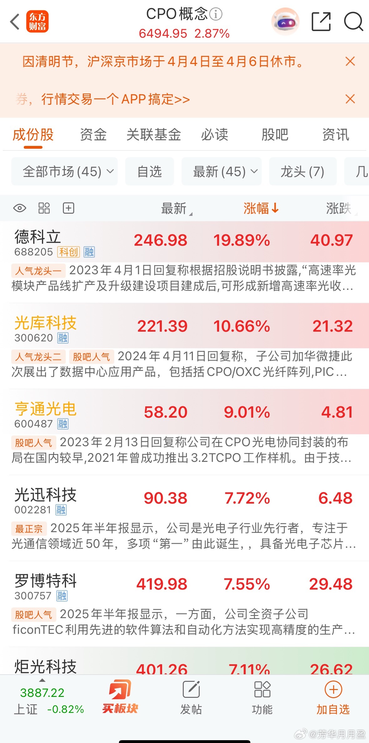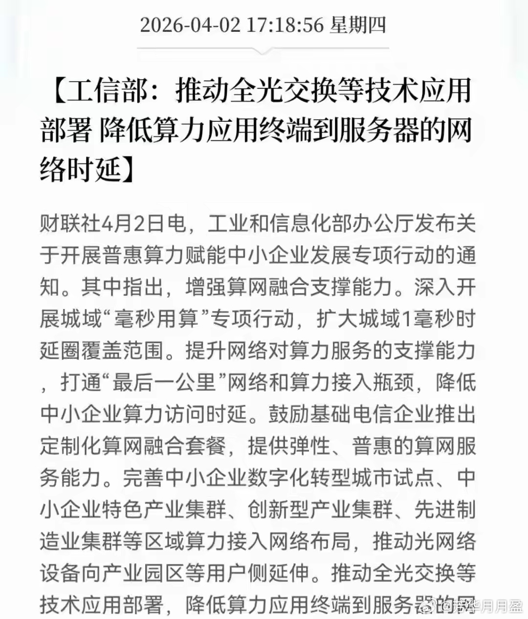 昨晚工信部发了支持OCS的文,这个很超预期。虽然有资金明显提前知道了,但还是超预期…这是第一次正经说这个,意味着技术路径的爆发。加上萝卜的订单利好,老馒头创新高和应用光电暴涨,萝卜今天不涨停就真的没脸了。同时利好空心光纤长飞、亨通,OCS的炬光、致尚、德科立、滕景科技、仕佳光子、源杰和长光华芯、智立方等。